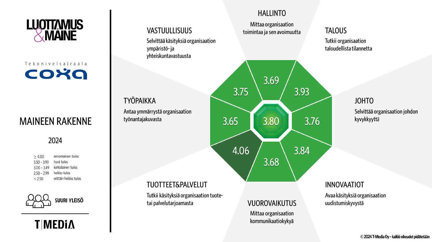 T-Median sosiaali- ja terveysalan Luottamus&Maine 2024 -tutkimuksen tiedonkeruu toteutettiin sähköisellä kyselylomakkeella 15.3.-15.4.2024. Organisaatioita arvioitiin tutkimusmallilla, jossa mainepistemäärä muodostuu kahdeksan eri osa-alueen keskiarvona. Osa-alueet ovat yrityksen hallinto, talous, johtaminen, innovatiivisuus, vuorovaikutus, tuotteet & palvelut, työpaikka ja vastuullisuus. Tutkimuksessa käytettiin viisiportaista arviointiasteikkoa (1–5).