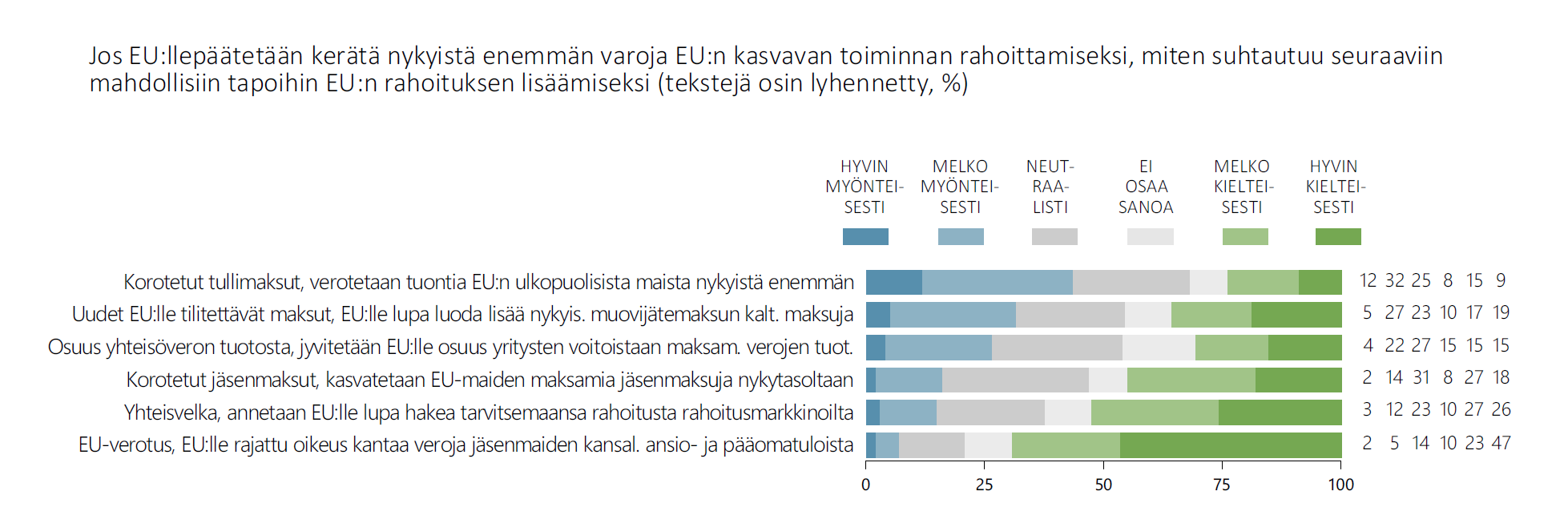 Kysymys EU:n rahoituksen kasvattamisesta Euroopan vahvan aseman turvaamiseksi on suomalaisille vaikea. Kolme kymmenestä (29 %) katsoo, että EU:n rahoitusta on lisättävä, mikäli halutaan, että Euroopalla on vahva asema maailmassa. Yhtä moni (28 %) on asiasta toista mieltä. Hyvin moni (43 %) ei ota asiaan kantaa.