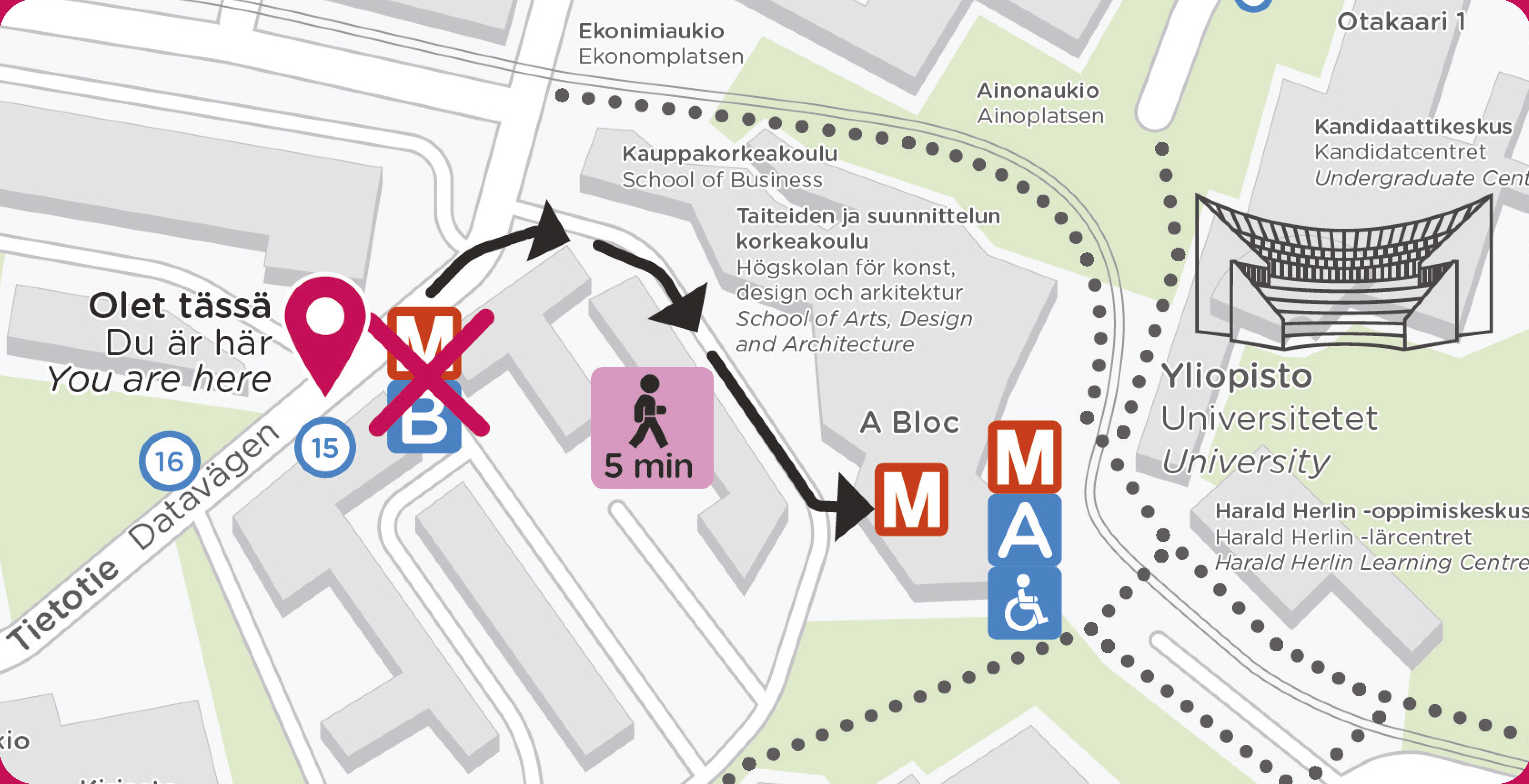 Aalto-yliopiston metroaseman Tietotien sisäänkäynti suljettuna 3.6. alkaen huoltotöiden takia