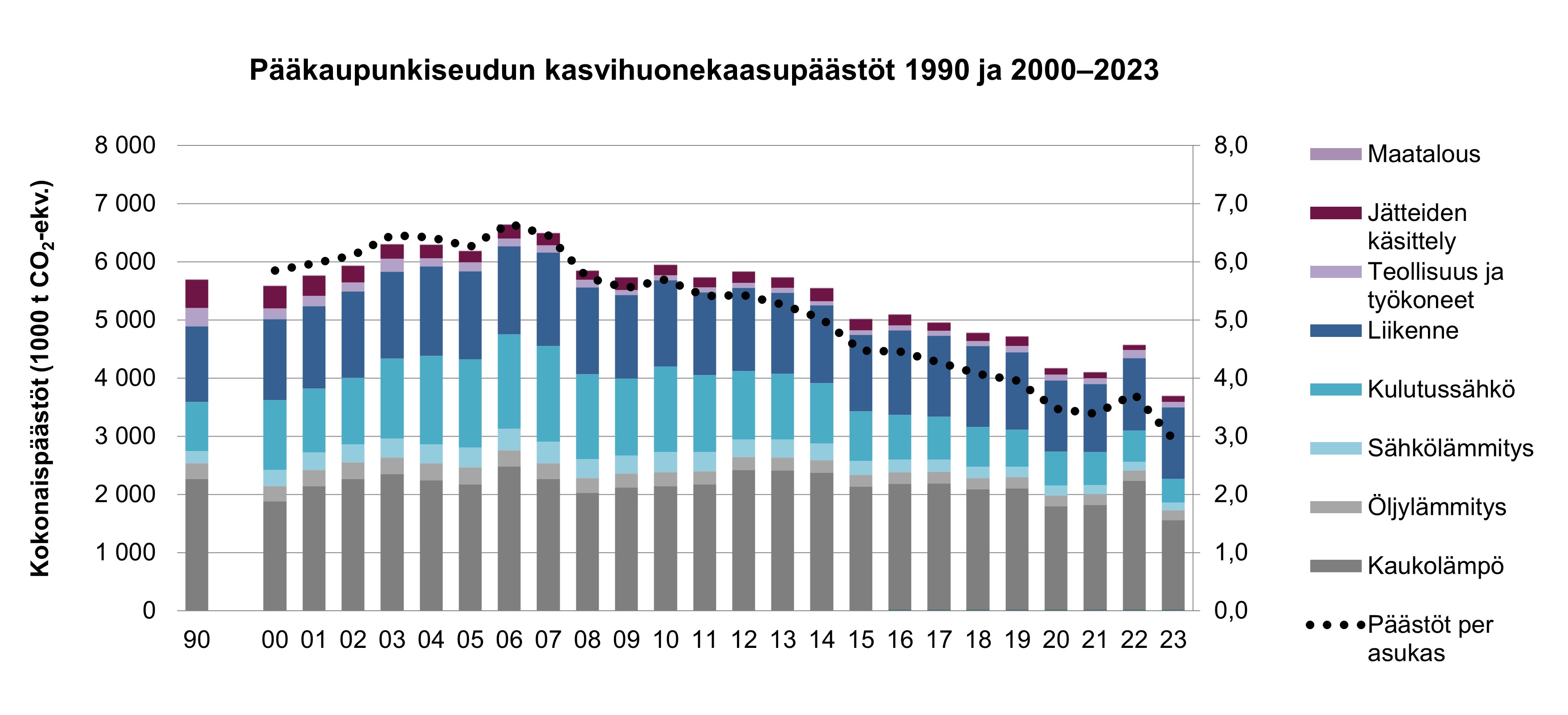 Helsingin seudun ympäristöpalvelut HSY laskee vuosittain pääkaupunkiseudun kasvihuonekaasupäästöt. Pääkaupunkiseudun kasvihuonekaasupäästöt ovat laskeneet usean vuoden ajan, poikkeuksena vuosi 2022, jolloin päästöt kasvoivat. Viime vuonna päästöt alkoivat jälleen laskea. Vuonna 2023 seudun kasvihuonekaasupäästöt laskivat lähes 20 prosenttia edellisvuoteen verrattuna. Seudun päästöt olivat yhteensä noin 3,7 miljoonaa tonnia hiilidioksidiekvivalenttia (CO2-ekv).