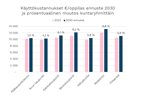 Selvityksessä kustannustarkastelua on tehty erityisesti kuntaryhmittäin. Arvion perusteella yksikkökustannusten kasvuun vuodesta 2022 vuoteen 2030 kohdistuu eniten painetta maaseutukunnissa ja seutukaupungeissa.