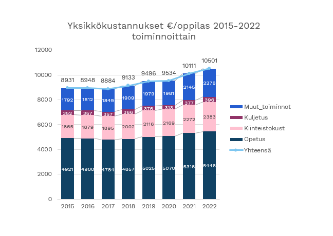 Koko maan tasolla perusopetuksen kiinteistökustannukset ovat nousseet vuosina 2015–2022 opetuksen kustannuksia nopeammin. Vuoden 2015 kustannukset olivat 1 865 €/oppilas ja vuonna 2022 se oli 28 prosenttia korkeampi 2 383 €/oppilas.