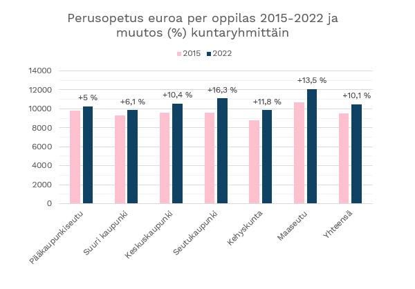 Perusopetuksen järjestämisen kustannukset vaihtelevat kunnissa. Selvityksen mukaan oppilaskohtaisten kustannusten kasvu (€/oppilas) vuosina 2015-2022 on kohdistunut niihin kuntiin, joissa oppilasmäärä on ollut laskeva. Kustannuskehitys on ollut maltillisinta pääkaupunkiseudulla ja suurissa kaupungeissa, jossa oppilasmäärät ovat olleet kasvussa.