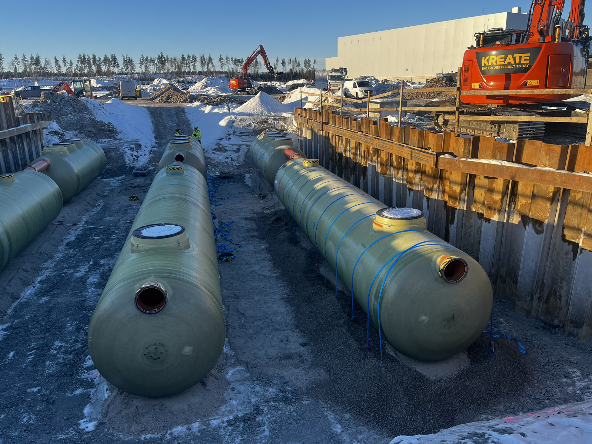 – Urakan vaativimpia työvaiheita oli isojen erottimien asentaminen tiukassa aikataulussa tuettuihin kaivantoihin keskellä kylmintä ja lumisinta talvea. Vahvuutenamme oli motivoituneen henkilöstön lisäksi oma pontituskalusto, jolla pystyimme tehostamaan asentamista viiden metrin syvyisissä kaivannoissa, kuvailee Varpula.