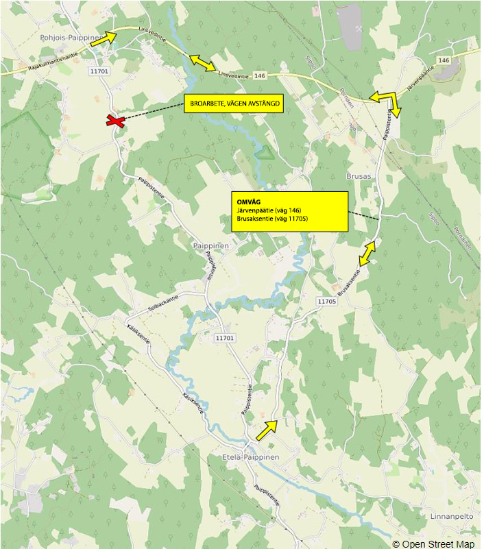 Paipisvägen (väg 11701) i Sibbo stängs för trafik medan Rosbacka bro förnyas. Under arbetet dirigeras trafiken till en omväg.
