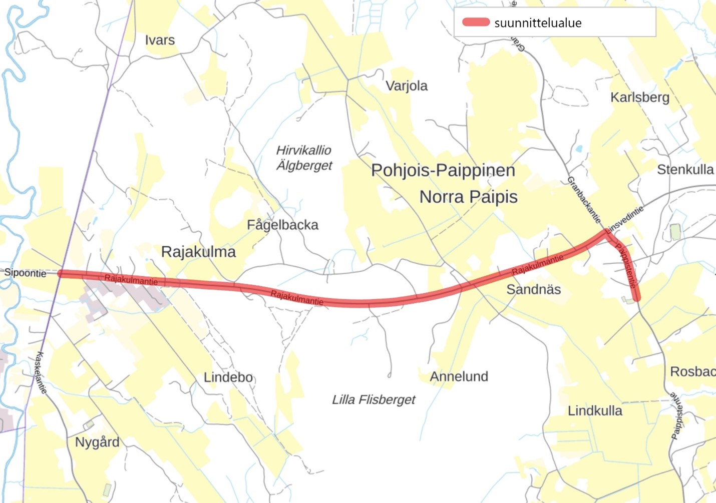 Karttakuva, jossa suunnittelualue merkitty punaisella viivalla eri paikkojen välillä.