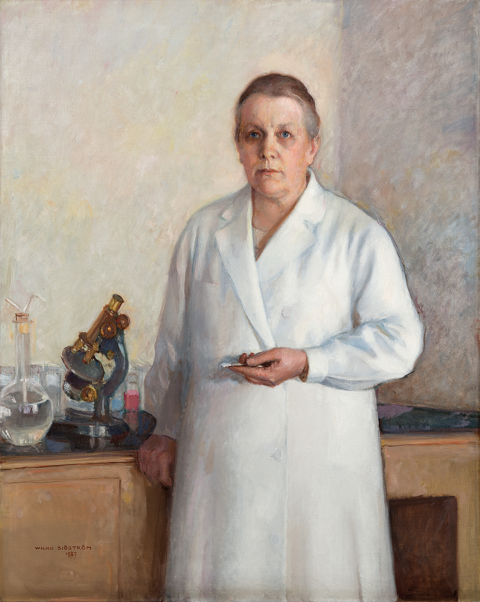 Wilho Sjöström: ”Laimi Leidenius”, 1937, öljy kankaalle, 115 × 96 cm, Helsingin yliopiston kokoelmat, Naistenklinikka