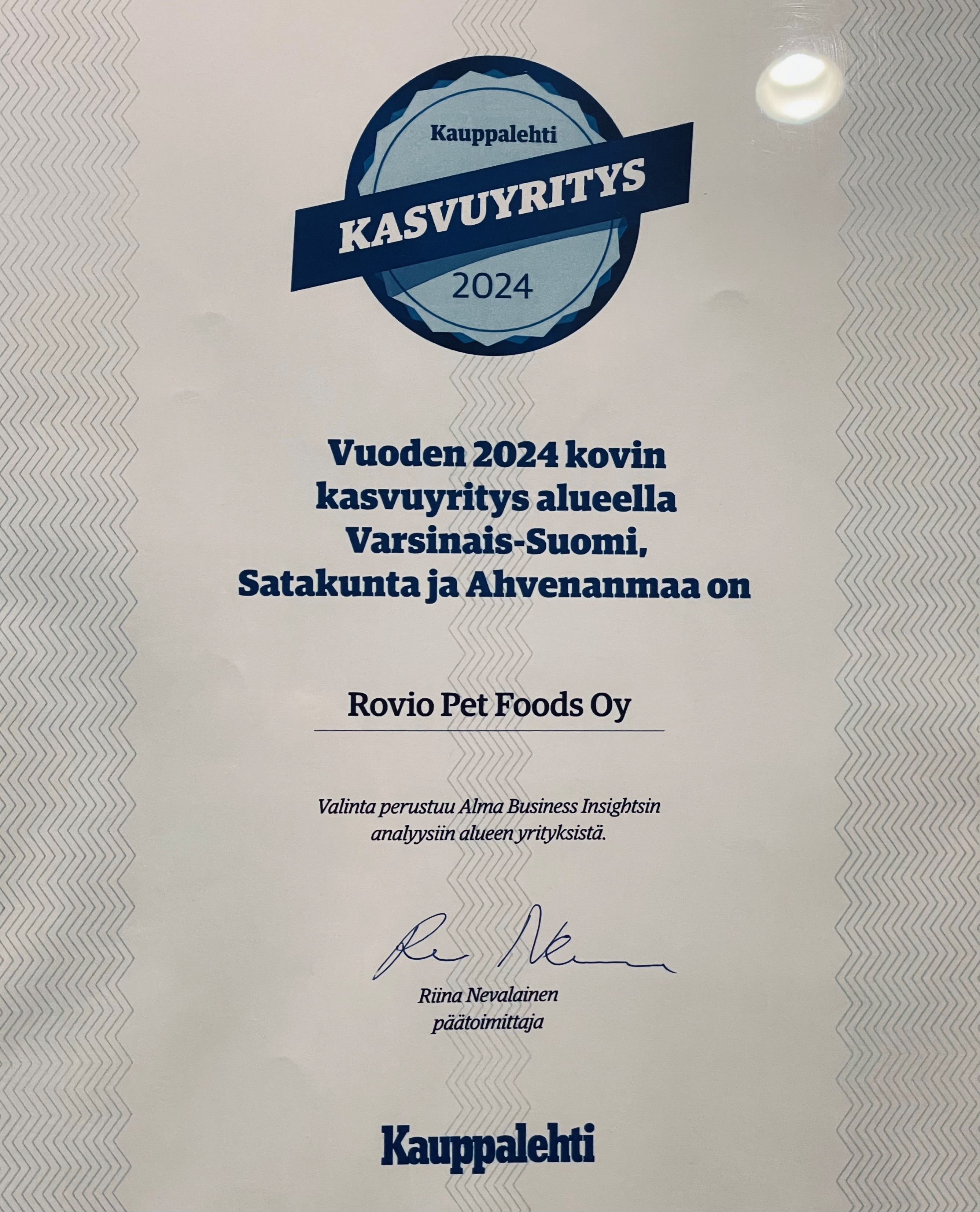 – Olemme erittäin ylpeitä saadessamme vastaanottaa Kasvaja-sertifikaatin tunnustuksena työmme tuloksista. Kiitos kuuluu koko henkilökunnalle, asiakkaille sekä sijoittajille, joiden luottamus on mahdollistanut menestyksemme. Jatkamme innolla kasvutarinaa, ja tavoitteemme on kehittyä johtavaksi vastuulliseksi asiantuntijaksi kotimaisessa lemmikkiruokamarkkinassa, kertoo yrityksen toimitusjohtaja Tero Rovio.