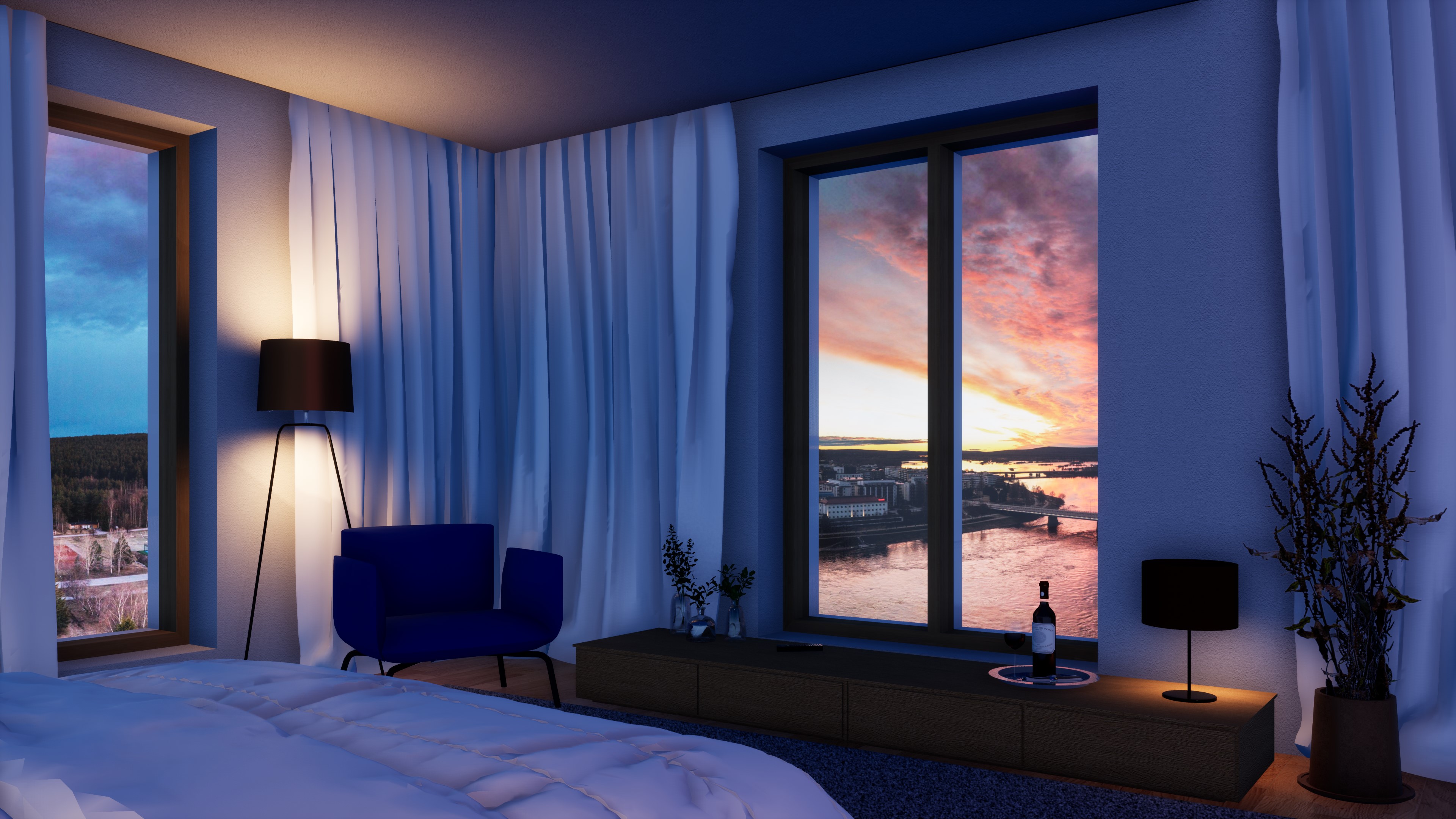 Hotellihuone, jossa näkymä iltataivaalle ja joelle.