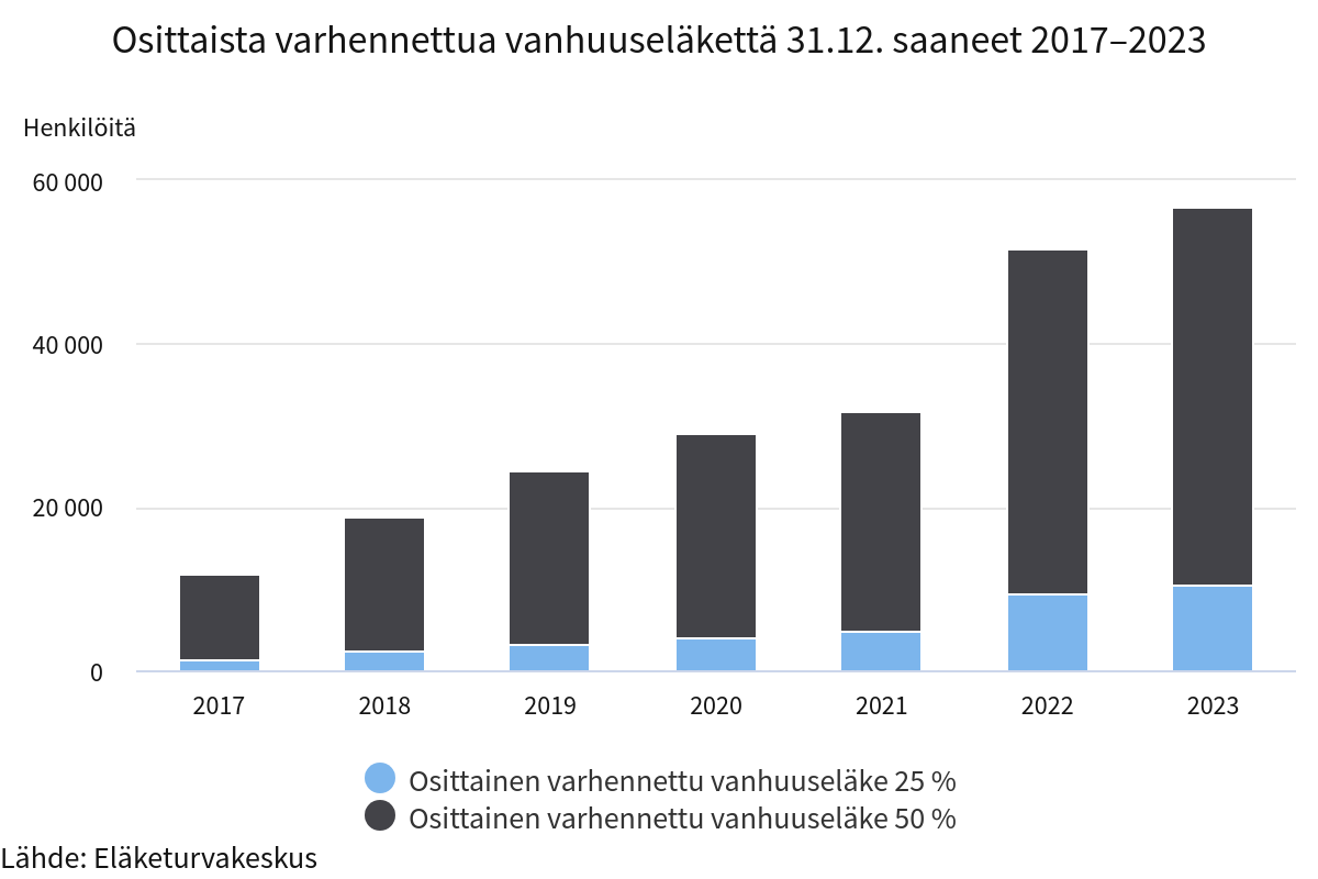 ETK:n tilastojen mukaan vuonna 2023 alkoi lähes 21 000 uutta osittaista vanhuuseläkettä. Määrä on puolitoistakertainen aikaisempaan vakiintuneeseen tasoon verrattuna, mutta 14 000 kappaletta edellisvuotta pienempi. Vuonna 2022 poikkeuksellinen indeksikehitys houkutteli aikaistamaan eläkkeen valinnan ennen vuodenvaihdetta.