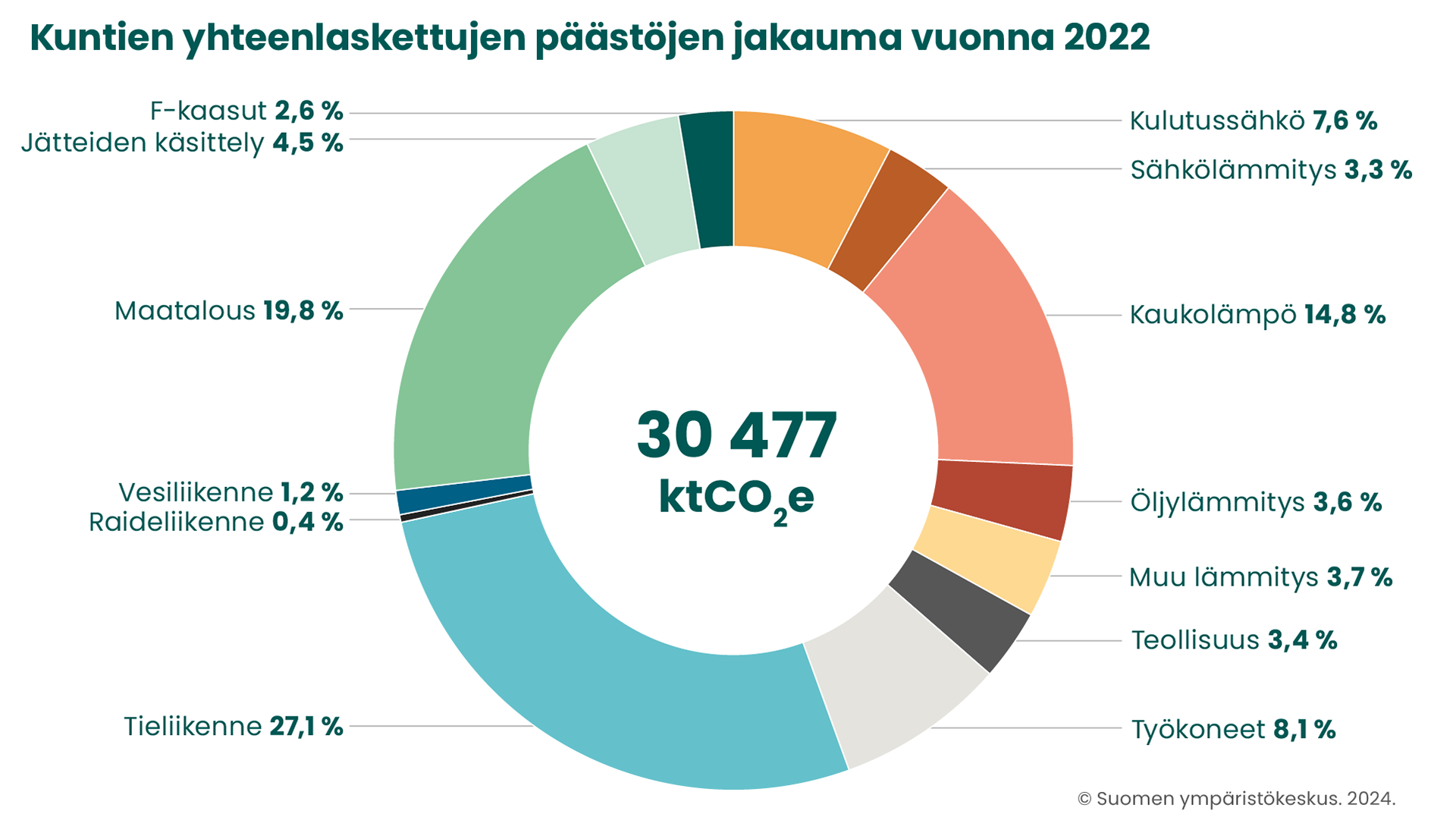 Vuoden 2022 kasvihuonekaasupäästöt laskivat 4,3 prosenttia edellisvuodesta. Suurimmat kasvihuonekaasujen päästölähteet olivat edellisvuosien tapaan tieliikenne, jonka päästöt olivat 27,1 prosenttia, maatalous 19,8 prosenttia ja kaukolämpö 14,8 prosenttia kokonaispäästöistä.