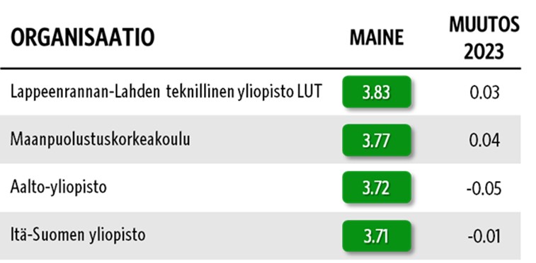 Yliopistojen maineikkaimpien kärjen muodostavat Lappeenrannan-Lahden teknillinen yliopisto LUT arvosanalla 3,83, Maanpuolustuskorkeakoulu (3,77) ja Aalto-yliopisto (3,72) sekä Itä-Suomen yliopisto (3,71).