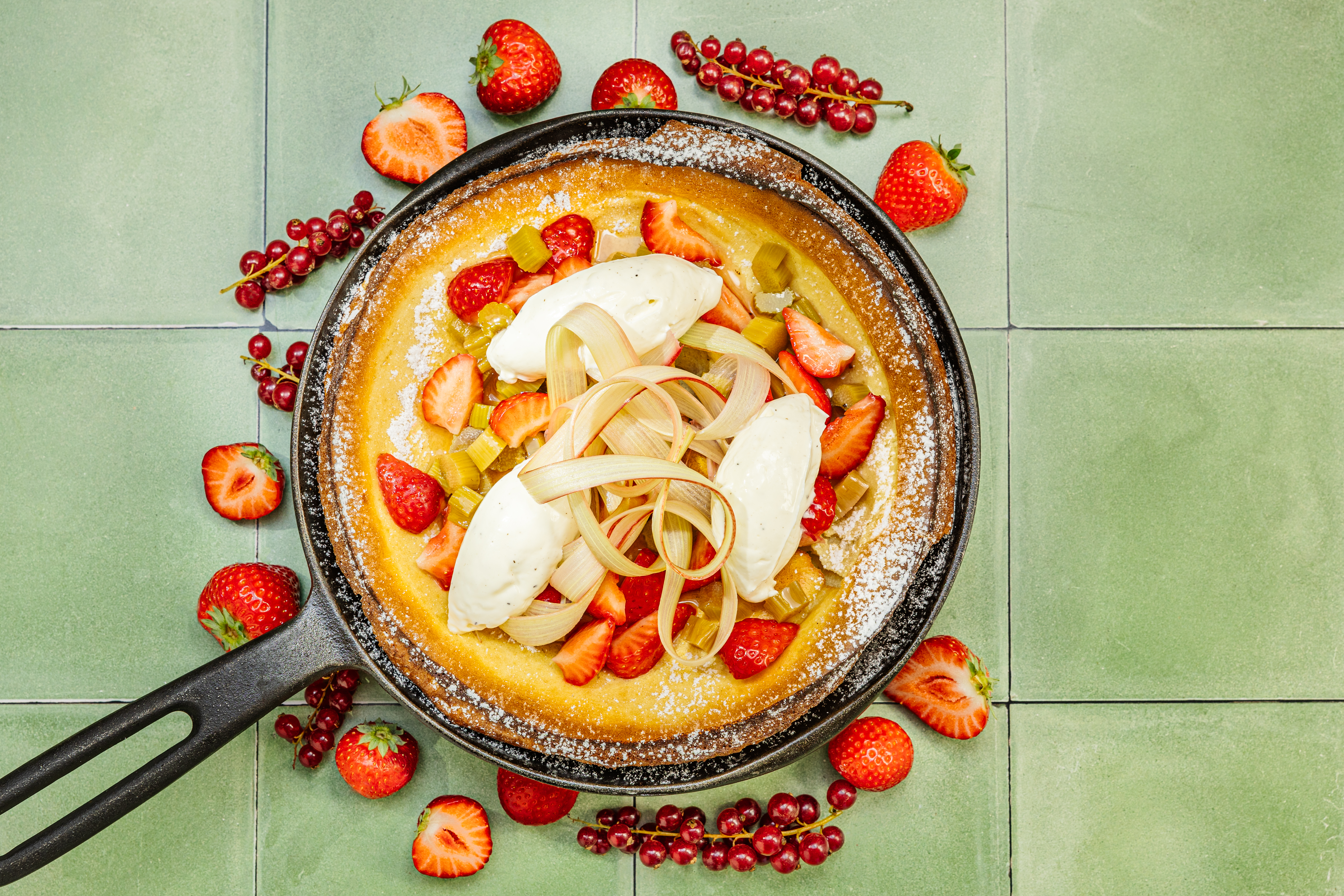 Pannukakkua, hillottua raparperia ja mansikkaa: https://www.mtk.fi/-/pannukakkua-raparperia-mansikkaa