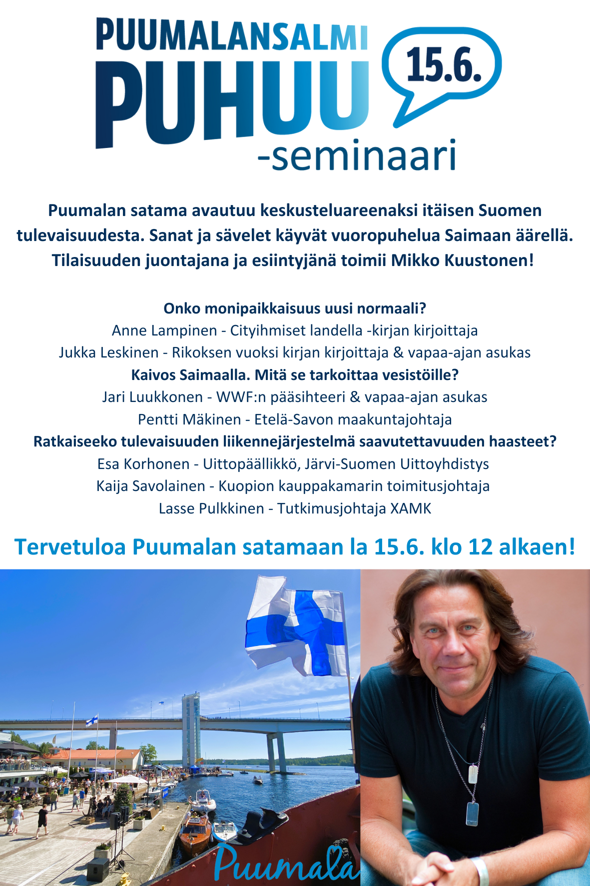 Uusi keskusteleva kesätapahtuma lanseerataan lauantaina 15.6. klo 12 Puumalan satamassa. Puhumme itäisen Suomen tulevaisuudesta sanoin ja sävelin Saimaan äärellä. Tilaisuuden juontajana ja esiintyjänä toimii Mikko Kuustonen.