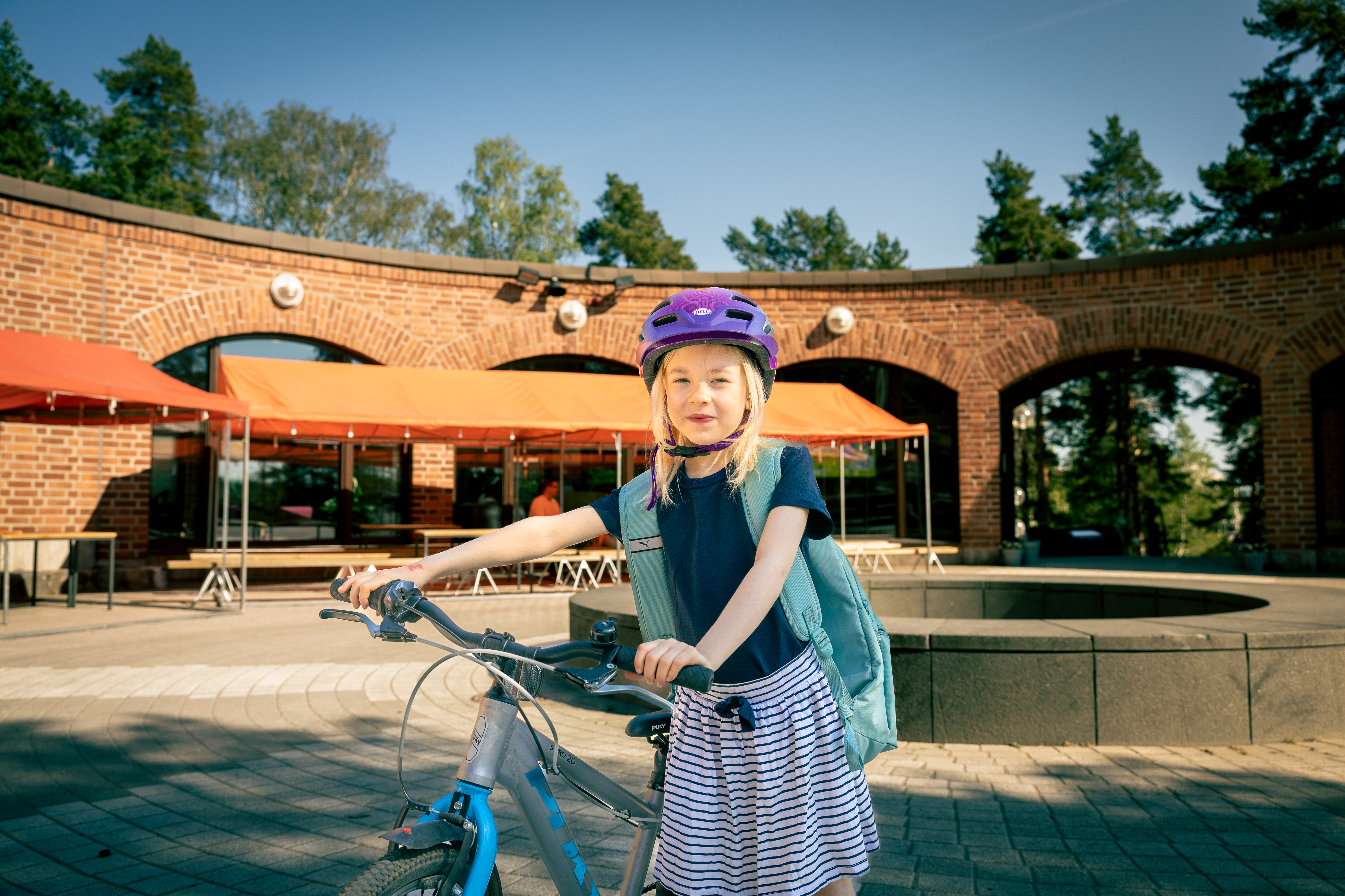 pieni koululainen polkupyöränsä kanssa ja reppu selässä Leppävaaran kirkon pihalla