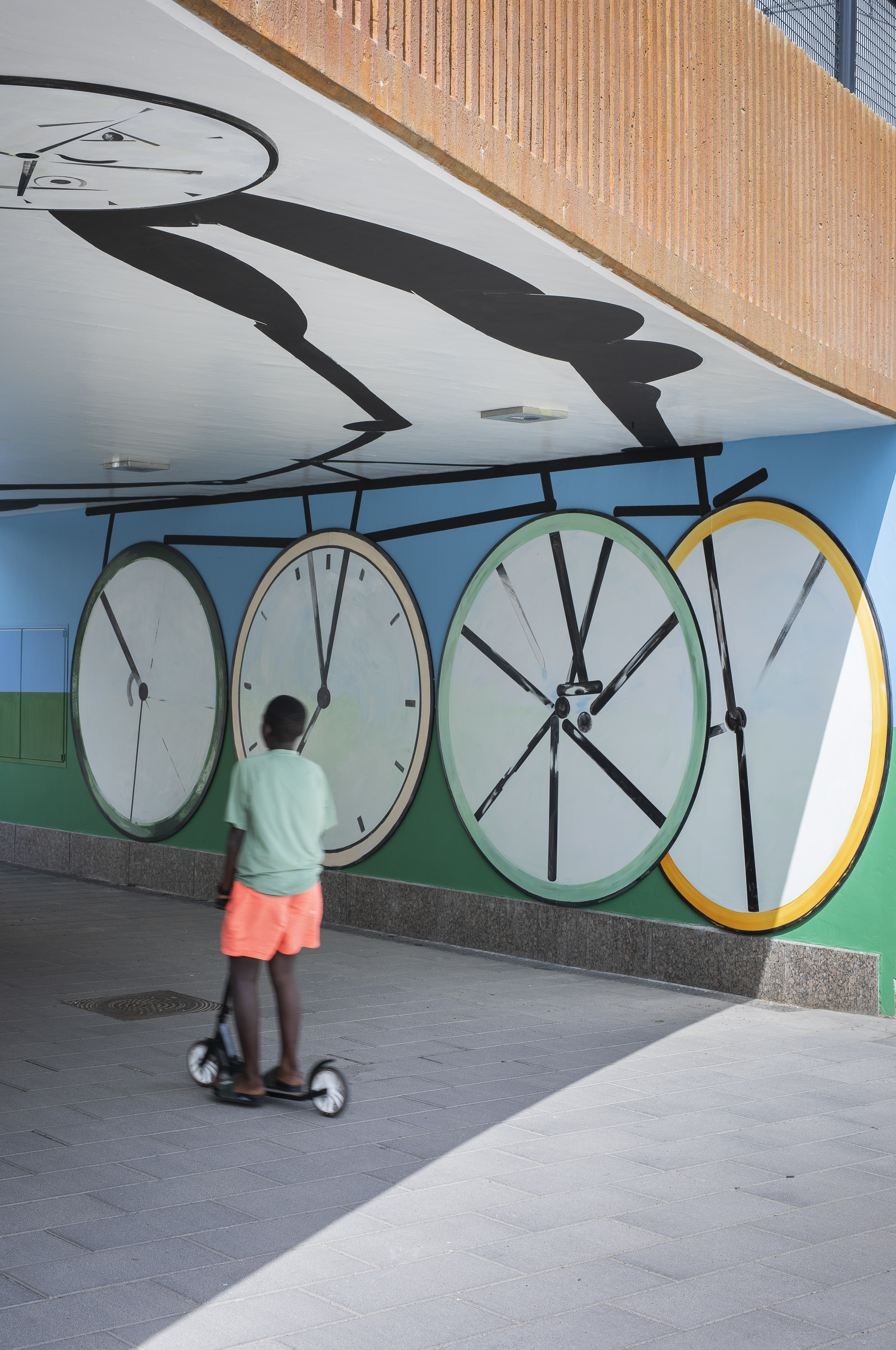 Lasse Juutis verk De samtida handlar om upplevelsen av tid. I verket kan klockor, cyklar och en dressin som vi känner till från järnvägarna identifieras. Konstnären berättar att dressinen pumpas av bröderna Nu och Snart, försedda med visarmustasch, som i sitt sjå med att veva tiden framåt tänjs ut ända upp till taket i gångtunneln. Som upplevelse är tiden både plastisk och fragmentarisk: ibland rusar den i väg, andra gånger sniglar den sig fram.