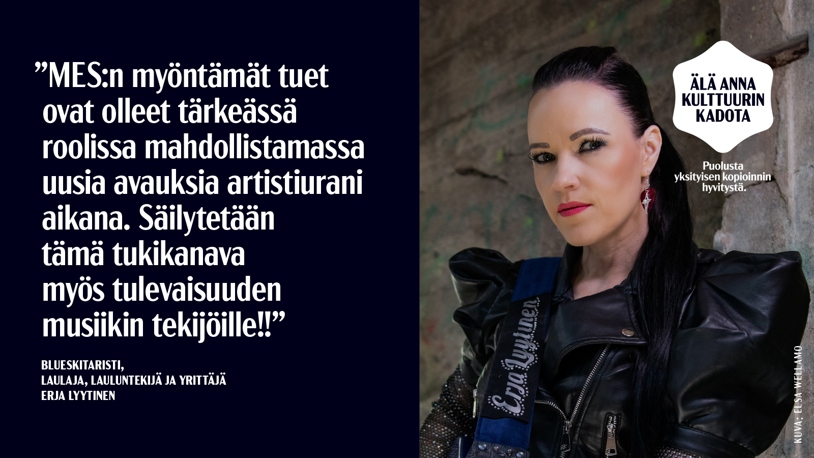 "MESin myöntämät tuet ovat olleet tärkeässä roolissa mahdollistamassa uusia avauksia artistiurani aikana. On tärkeää säilyttää tämä mahdollisuus myös tulevaisuuden musiikin tekijöille", sanoo kampanjakasvona mukana oleva, kansainvälisesti menestynyt blueskitaristi, laulaja, lauluntekijä ja yrittäjä Erja Lyytinen.
