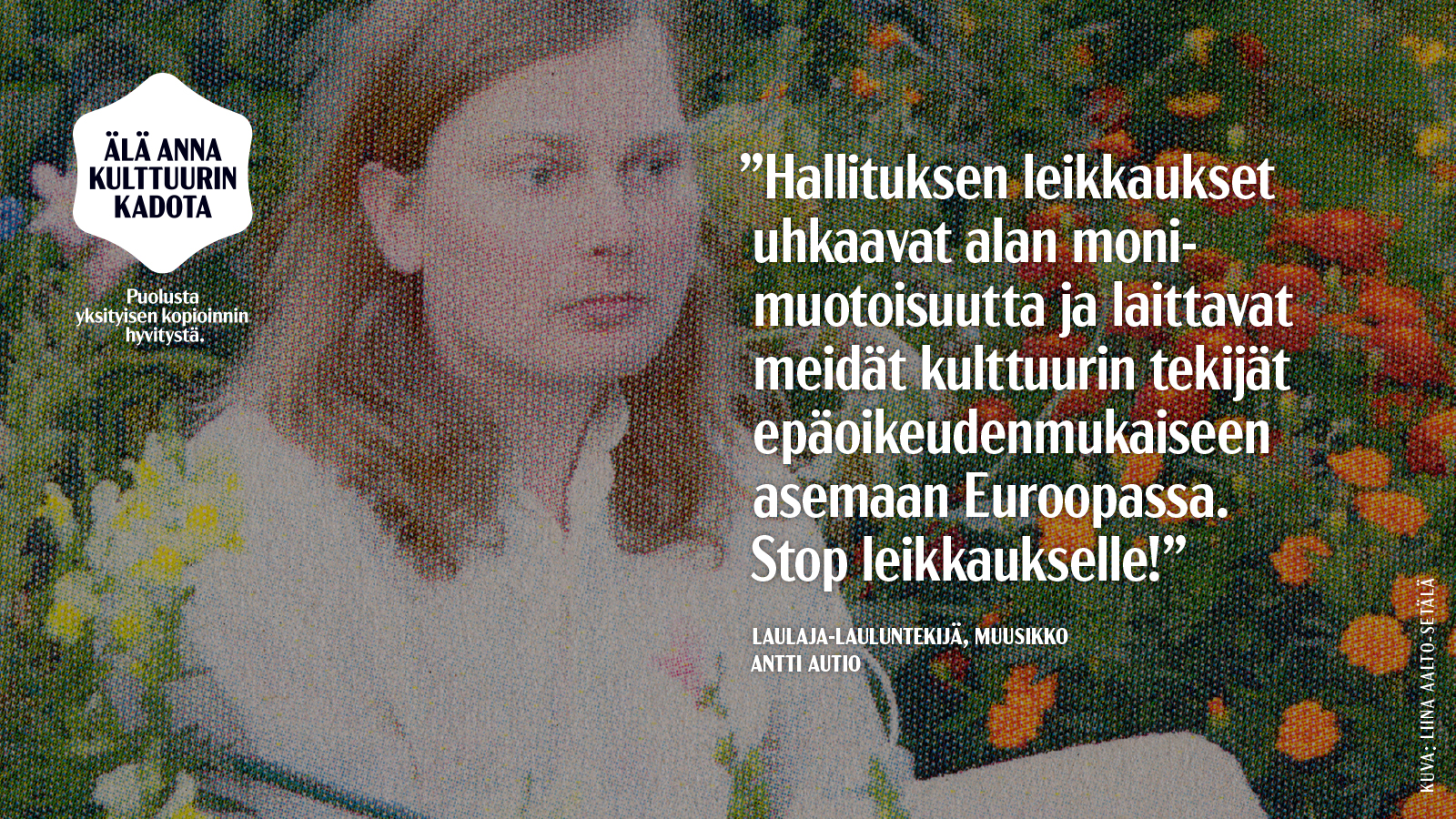 Tänään käynnistynyt laaja luovien alojen Älä anna kulttuurin kadota -kampanja vaatii päättäjiä säilyttämään oikeudenmukaisen yksityisen kopioinnin hyvityksen. Hallituksen kehysriihen päättämä leikkaus 11 miljoonasta 5,5 miljoonaan olisi luovan alan järjestöjen mukaan perusteeton ja tuhoisa kulttuuritarjonnalle ympäri Suomen. Gramex on mukana kampanjan toteuttajana.