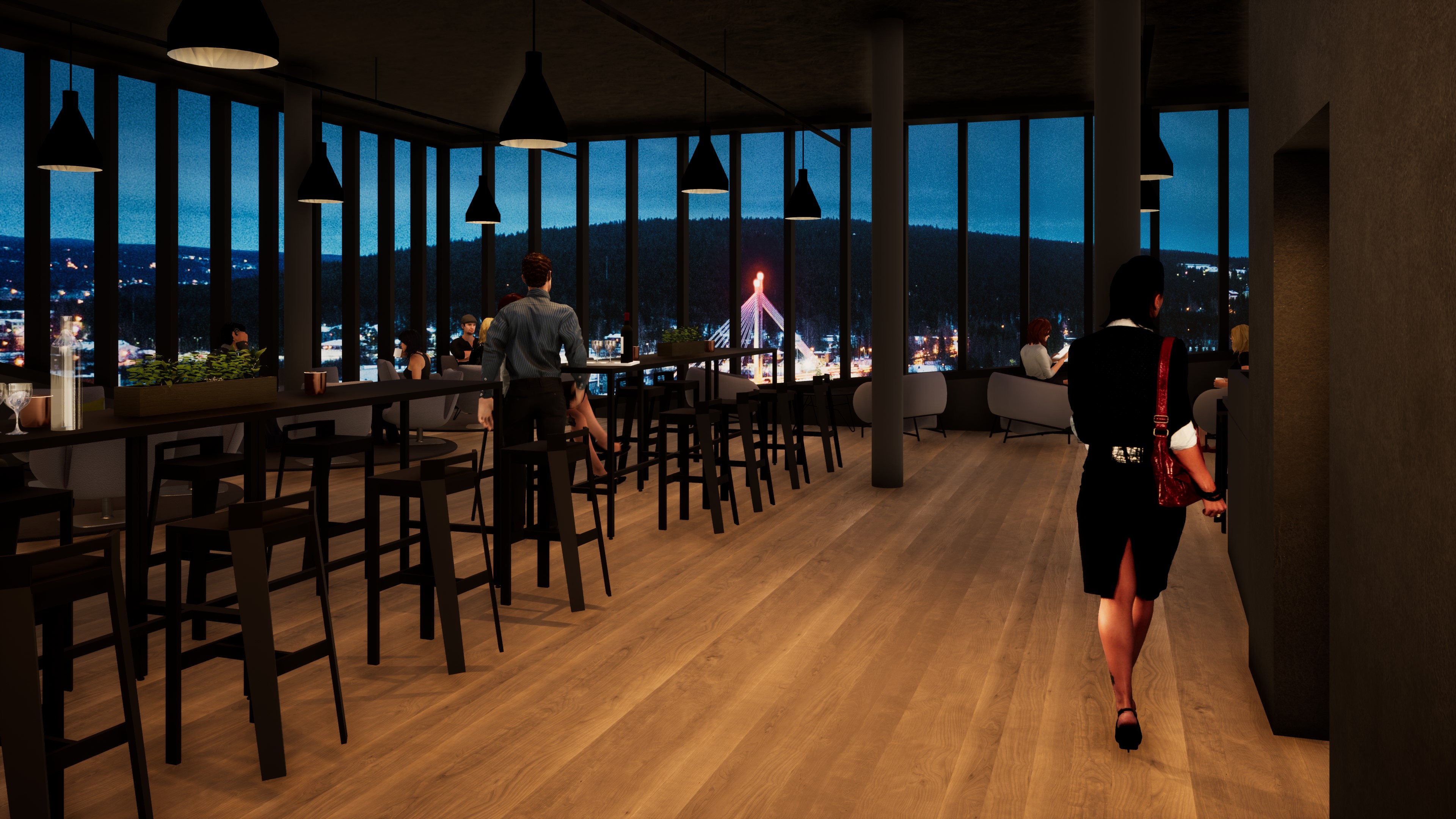 - Elämykselliset katutason ruokaravintola ja kahvila sekä näköalaravintola kattokerroksessa (yhteensä 530 asiakaspaikkaa)