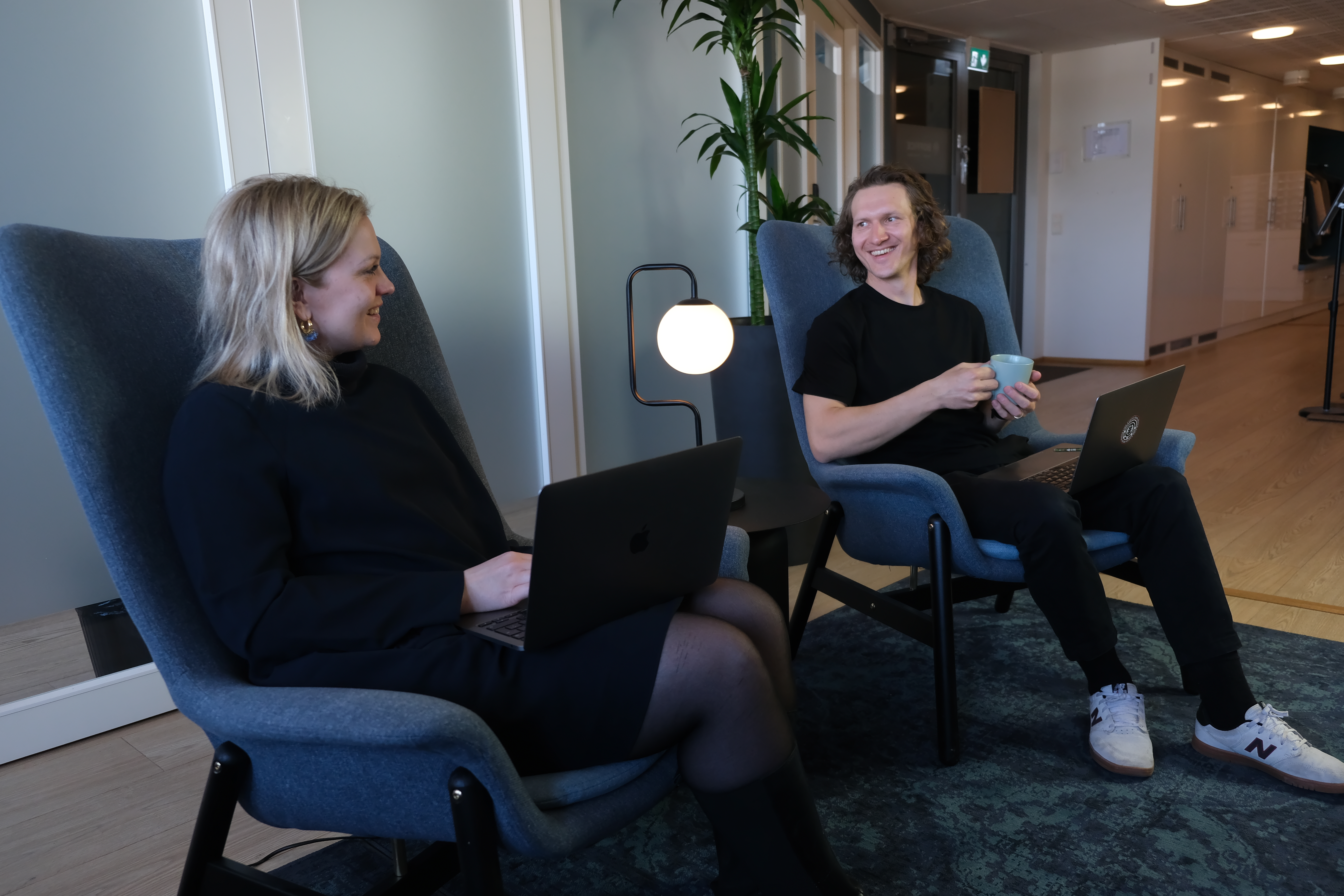 Mediashaken työntekijät viihtyvät uusissa tiloissa Helsingin ytimessä. Kuvassa Tuuli Latva-Teikari ja Joonas Rotko.