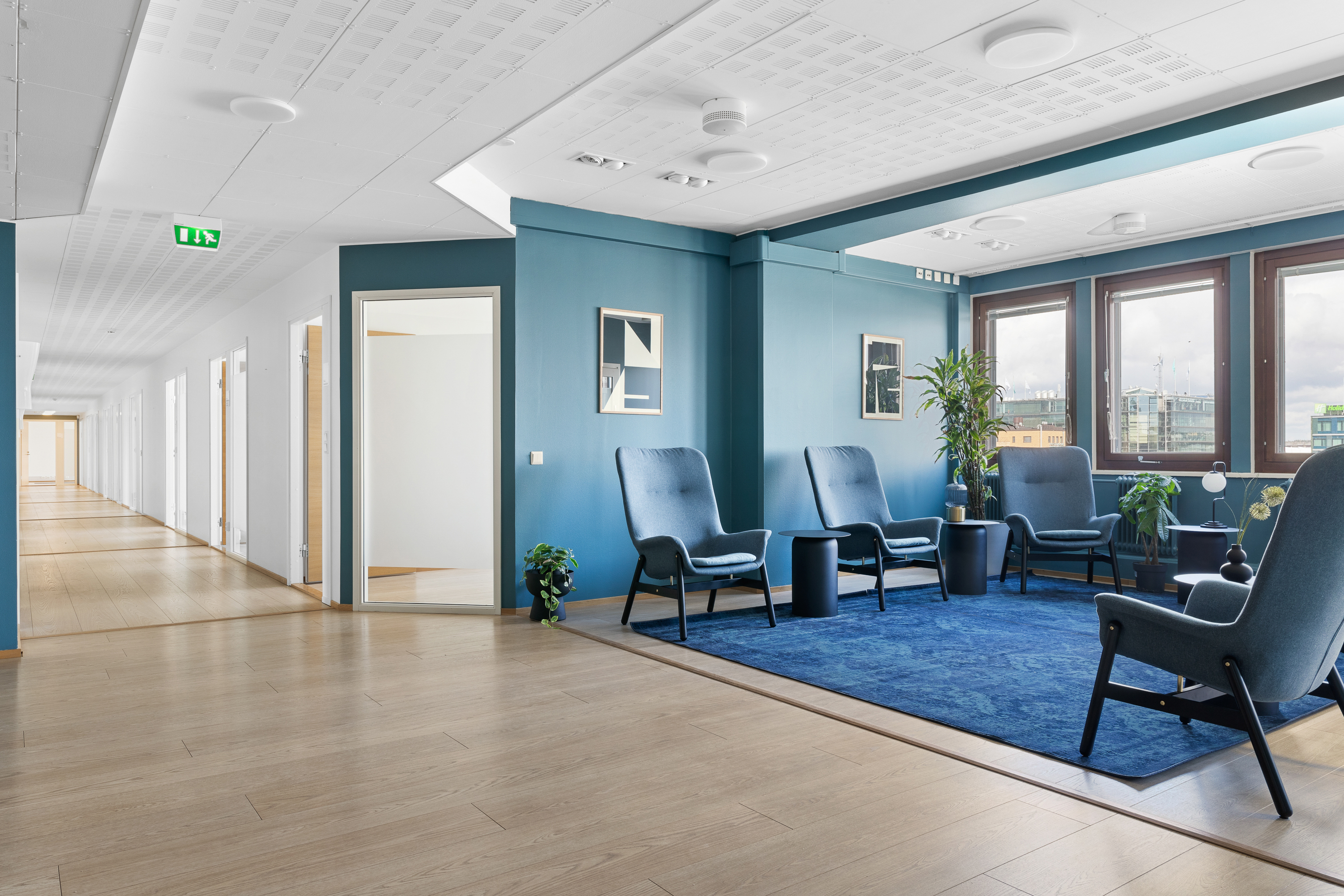 Kaivokadun toimistohotellin tilat on maalattu pirteillä sinisen sävyillä. Tiloja käyttää vakituisesti 12 yritystä.