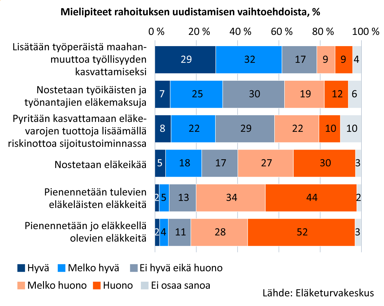 Reilut 60 prosenttia suomalaisista pitää työperäistä maahanmuuttoa hyvänä keinona, jos eläkkeiden rahoitusta pitäisi vahvistaa. Uuden Eläkebarometrin mukaan toiseksi mieluisin vaihtoehto on eläkemaksujen korottaminen. Sen sijaan nykyisten ja tulevien eläkkeiden leikkauksia vastustaa valtaosa vastaajista.