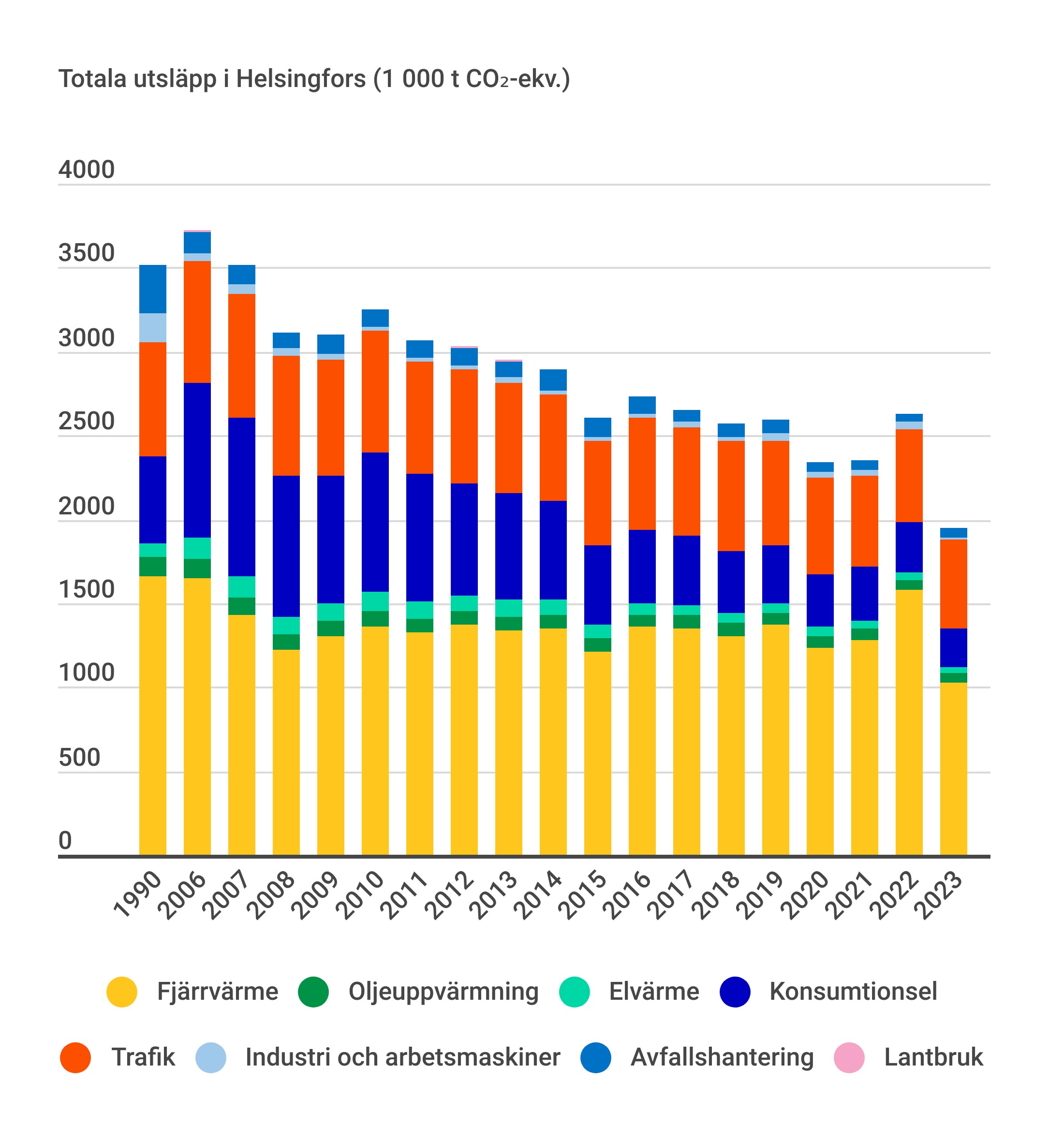 Helsingfors utsläpp av växthusgaser har minskat mycket kraftigt på kort tid, även om den exceptionella utsläppssituationen 2022 beaktas. Minskningen av de totala utsläppen från 2021 till 2023 var 17 procent.