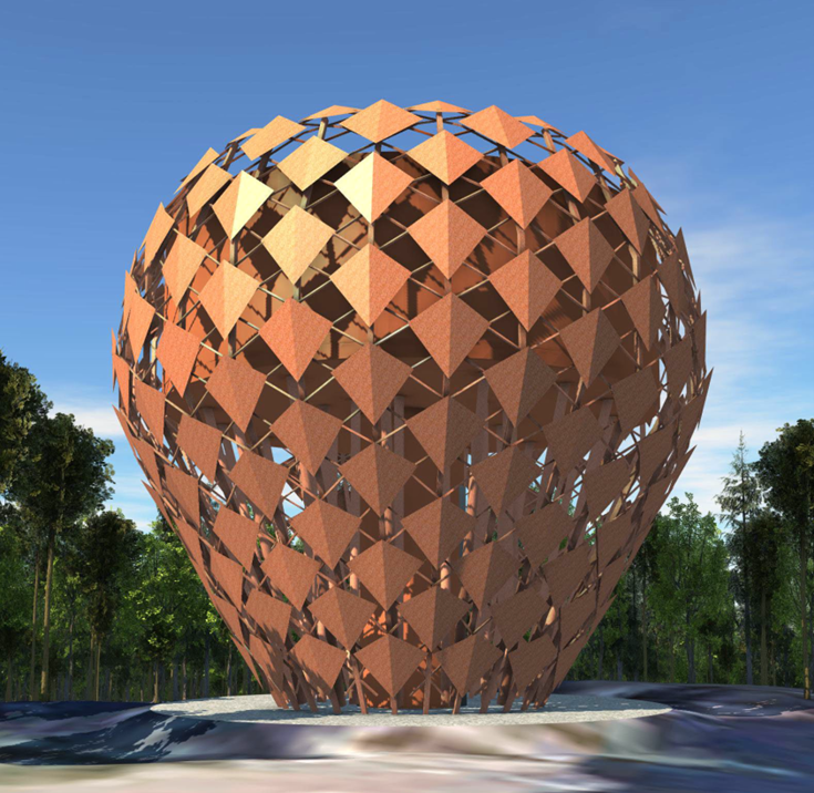 Vesitornin rakenne on yksinkertainen, sillä käpymäisen verhorakenteen takana on perinteinen sienimäinen tornirakenne. Vesitornin julkisivu runkoineen on tarkoitus tehdä Corten-teräksestä. Suomujen mitoitus on optimoitu alkuperäisen Corten-levyn maksimimitoista.