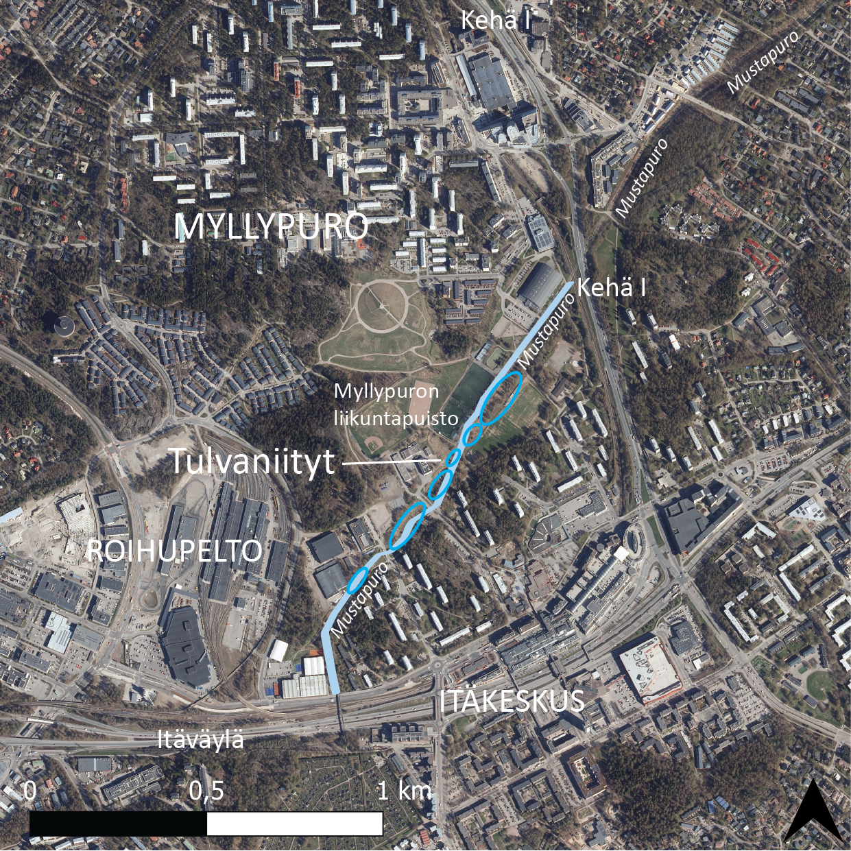 Myllypuron liikuntapuiston alueella on alkanut urakka, jossa Mustapuron ympäristöön rakennetaan tulvatasanteita, kylvetään rantaniittyjä sekä uusitaan siltoja. Työt ovat osa Helsingin kaupungin toimia ilmastonmuutoksen aiheuttamien tulvien varalle.
