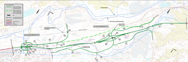 Näiden tietojen perusteella hankeryhmä päätti jättää E5 Horsbäckin eritasoliittymän pois suunnitelmasta. Ratkaisu kahdella eritasoliittymällä (E4 Langansböle ja E6 Västerbacka) täyttää valtatien ja paikallisliikenteen tarpeet riittävällä palvelutasolla (kuva 1).