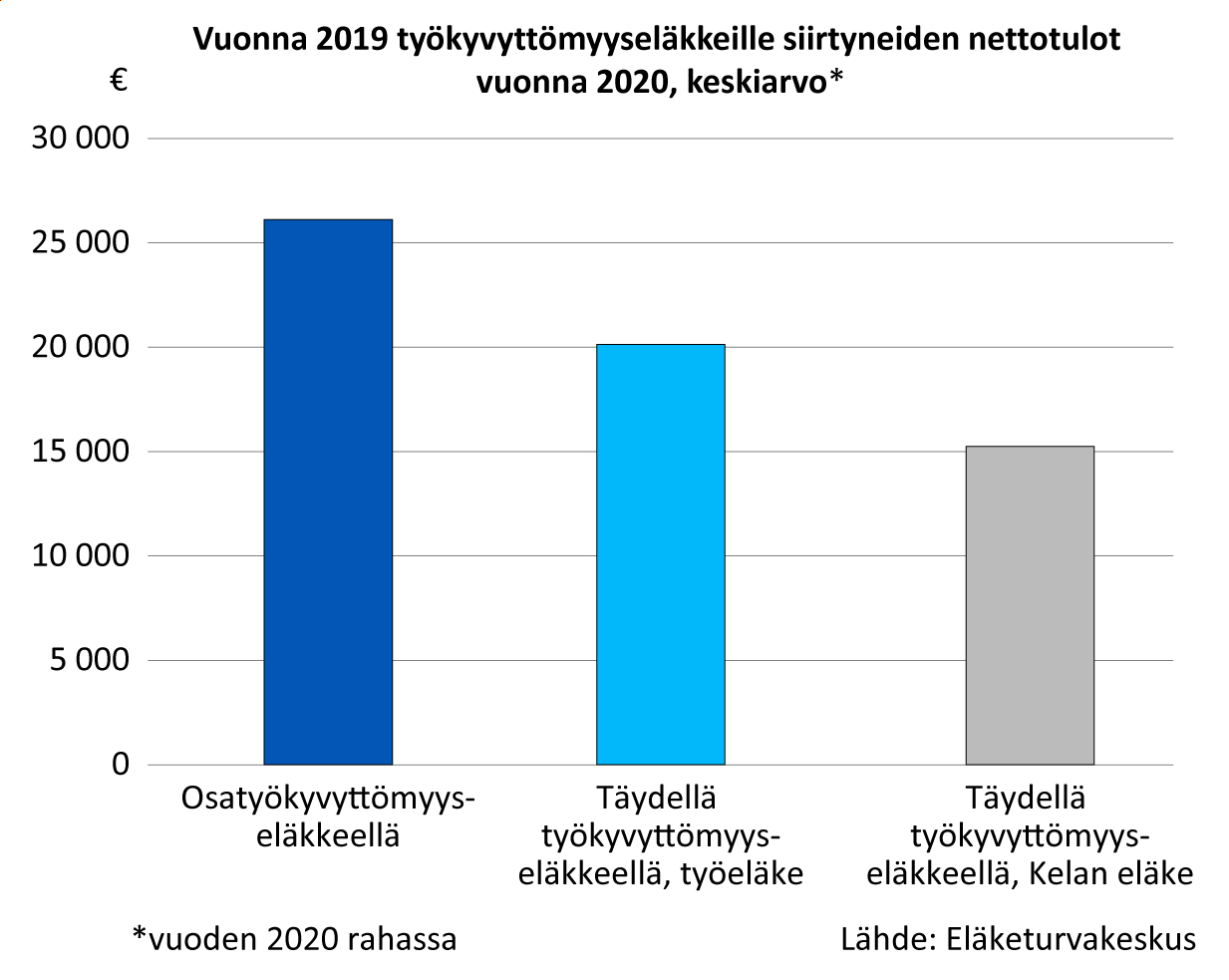 Korkein tulotaso oli osatyökyvyttömyyseläkkeelle siirtyneillä, keskimäärin 26 000 euroa vuodessa eli noin 2 170 euroa kuukaudessa. Tämä oli lähes kolmanneksen enemmän kuin täydelle työkyvyttömyyseläkkeelle siirtyneillä, joilla nettotulot olivat keskimäärin 20 100 euroa vuodessa eli noin 1 680 euroa kuukaudessa.