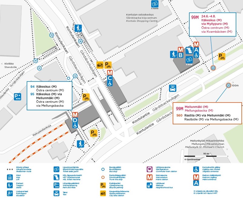 Bussi 99M alkaa kulkea Itäkeskukseen asti 24.6. alkaen. Bussin reitti on 24.6.-4.8. välillä Mellunmäki - Kontula - Myllypuro (Liikuntamylly) - Itäkeskus. Metron pääteasemana on 24.6. alkaen Myllypuro, mutta pääset Kontulasta ja Mellunmäestä metroon helpoiten matkustamalla bussilla suoraan Itäkeskukseen.
