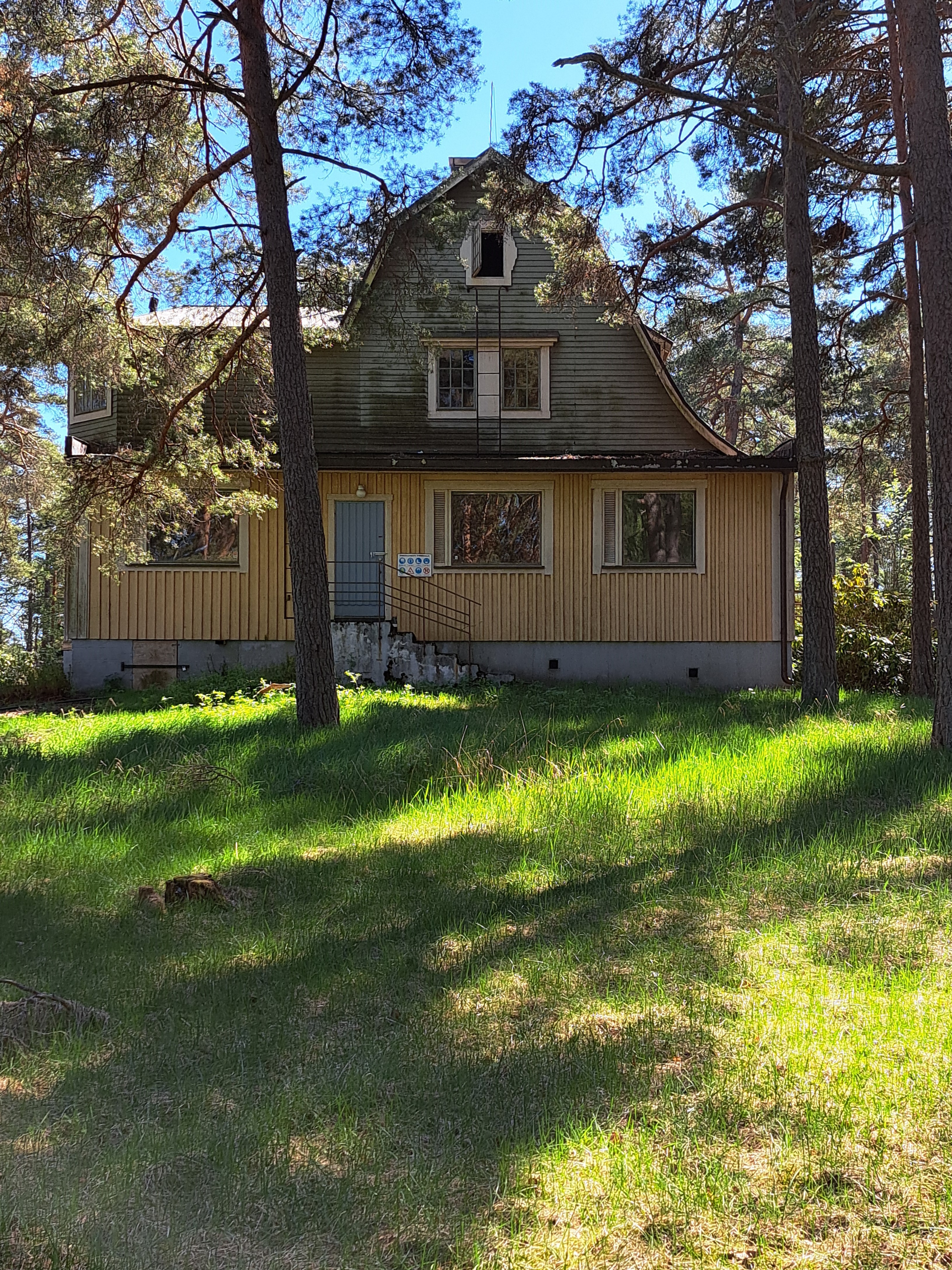 Huvilan päärakennus on alaosastaan keltaiseksi ja yläosastaan tummanvihreäksi maalattu mansardikattoinen rakennus, jossa on kaksi kerrosta ja ullakko. Pinta-ala on noin 275 m². Rakennus on osittain suojeltu, ja siinä on viimeksi ollut lasten leiritoimintaa.