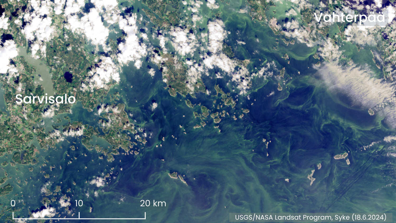 The cyanobacterial maps presented on the websites MarineFinland.fi and Waterinfo.fi combine the observations reported to the Järvi-meriwiki and from the beaches of the City of Helsinki, as well as the observations based on satellite interpretations made by Syke during the last three days.