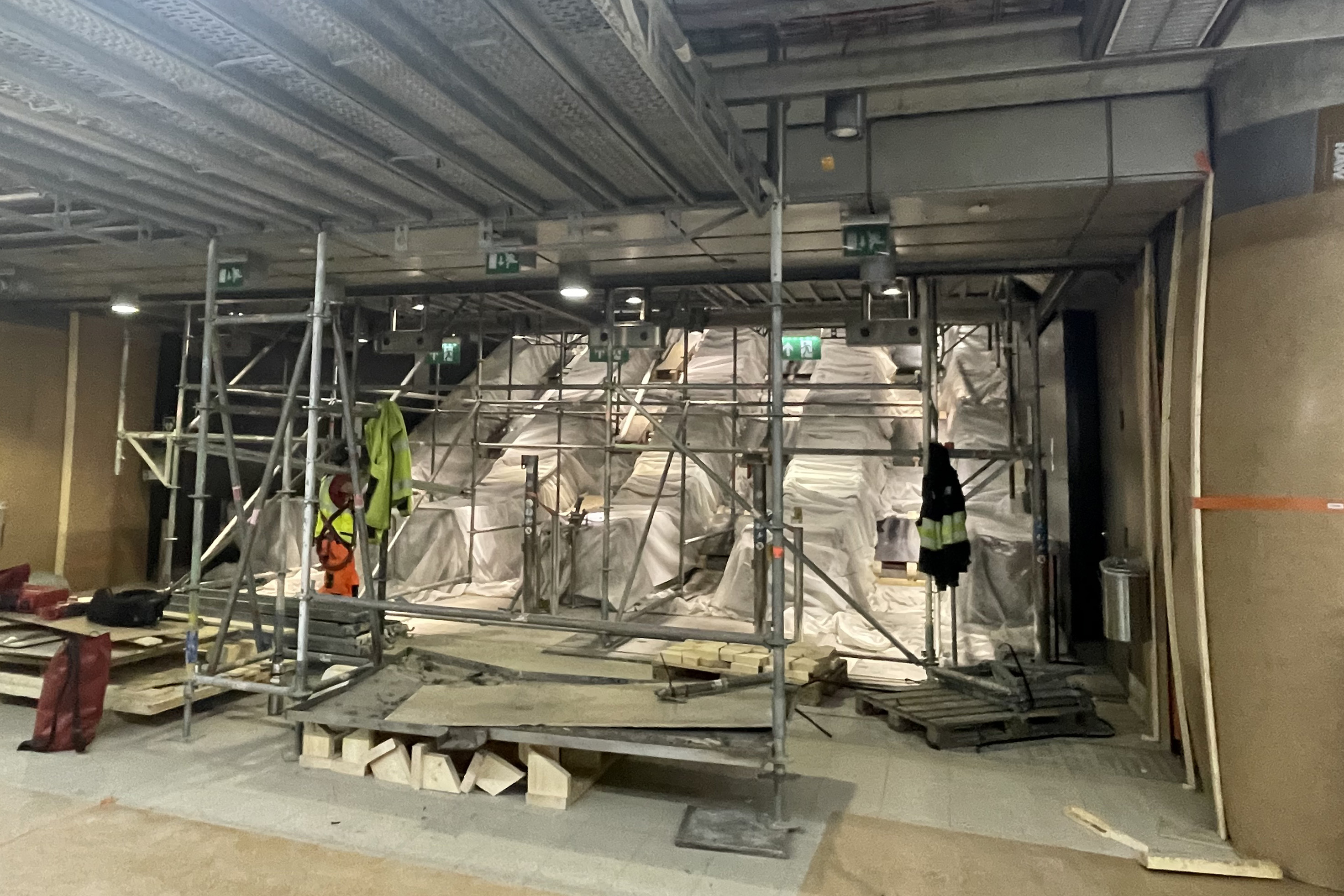 Rautatientorin metroaseman liukuportaat peitettynä ja ympärillä rakennustelineitä.