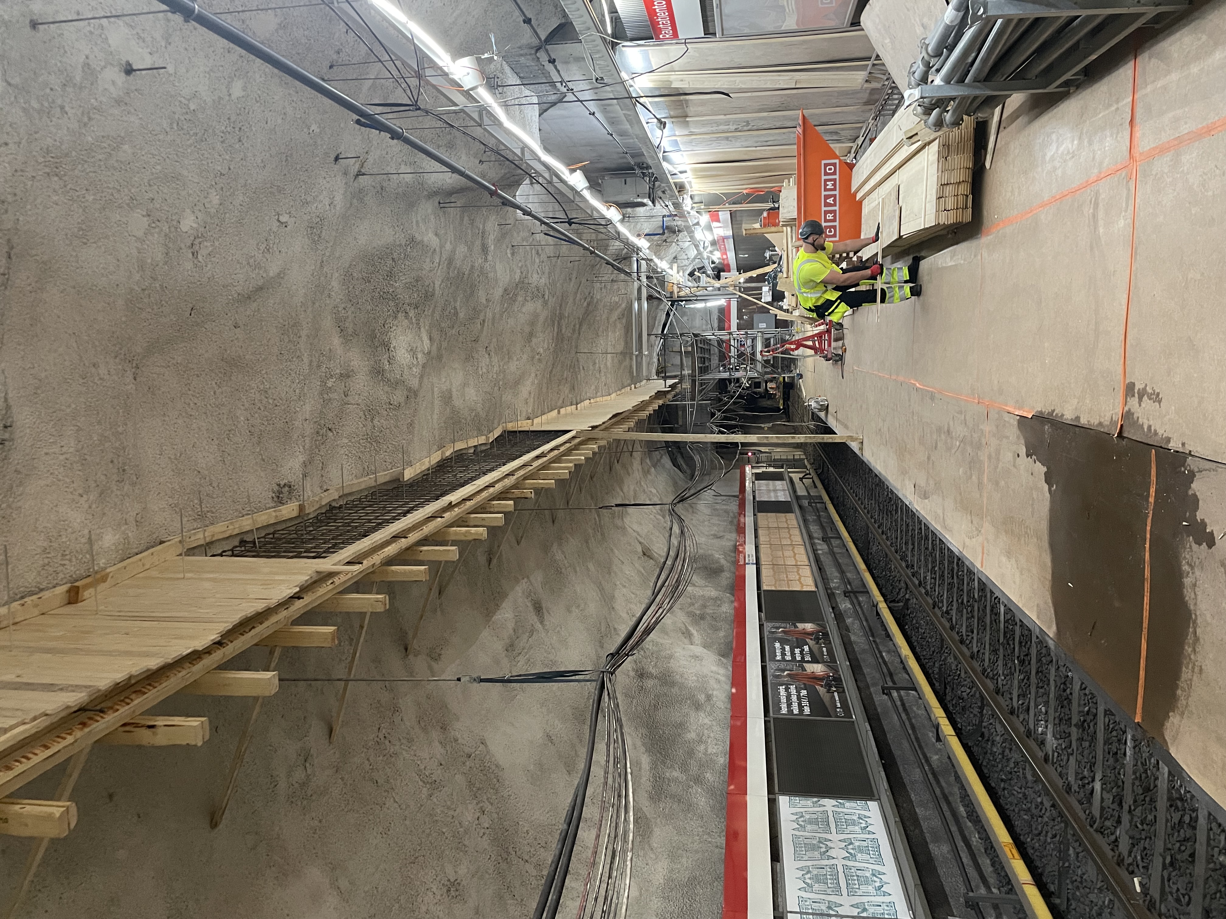 Raiteilla tehdään louhintatöitä tunnelissa, jotta uudet savuovet saadaan asennettua. Savuovilla erotetaan metrotunneli ja laiturialue toisistaan. Tällä viikolla on aloitettu asentaa savusulun rakenteita. Edelliseen liittyvien raiteiden savuovien betoniset pieliseinien työt ovat käynnistyneet.