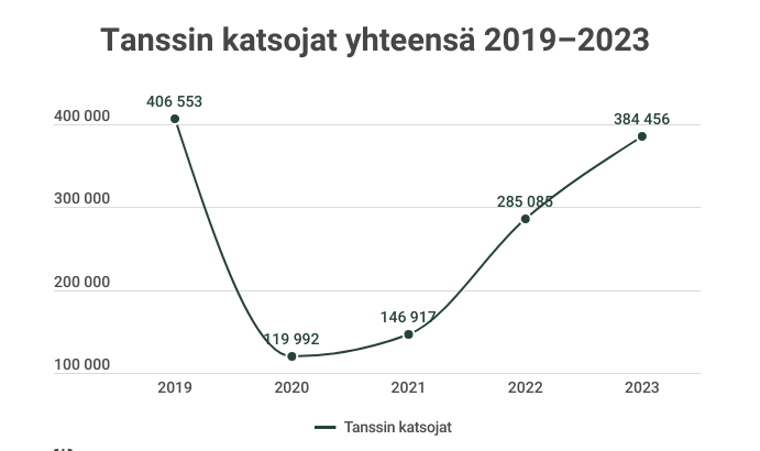Suomalaiset tanssiryhmät ja tuotantokeskukset toivat vuonna 2023 teoksiaan yleisöjen nähtäviksi lähes 2600 kertaa eri puolilla Suomea ja 15 muussa maassa. Esitykset keräsivät yhteensä runsaat 385 000 katsojaa, eli lähes yhtä paljon kuin pandemiaa edeltävinä vuosina.