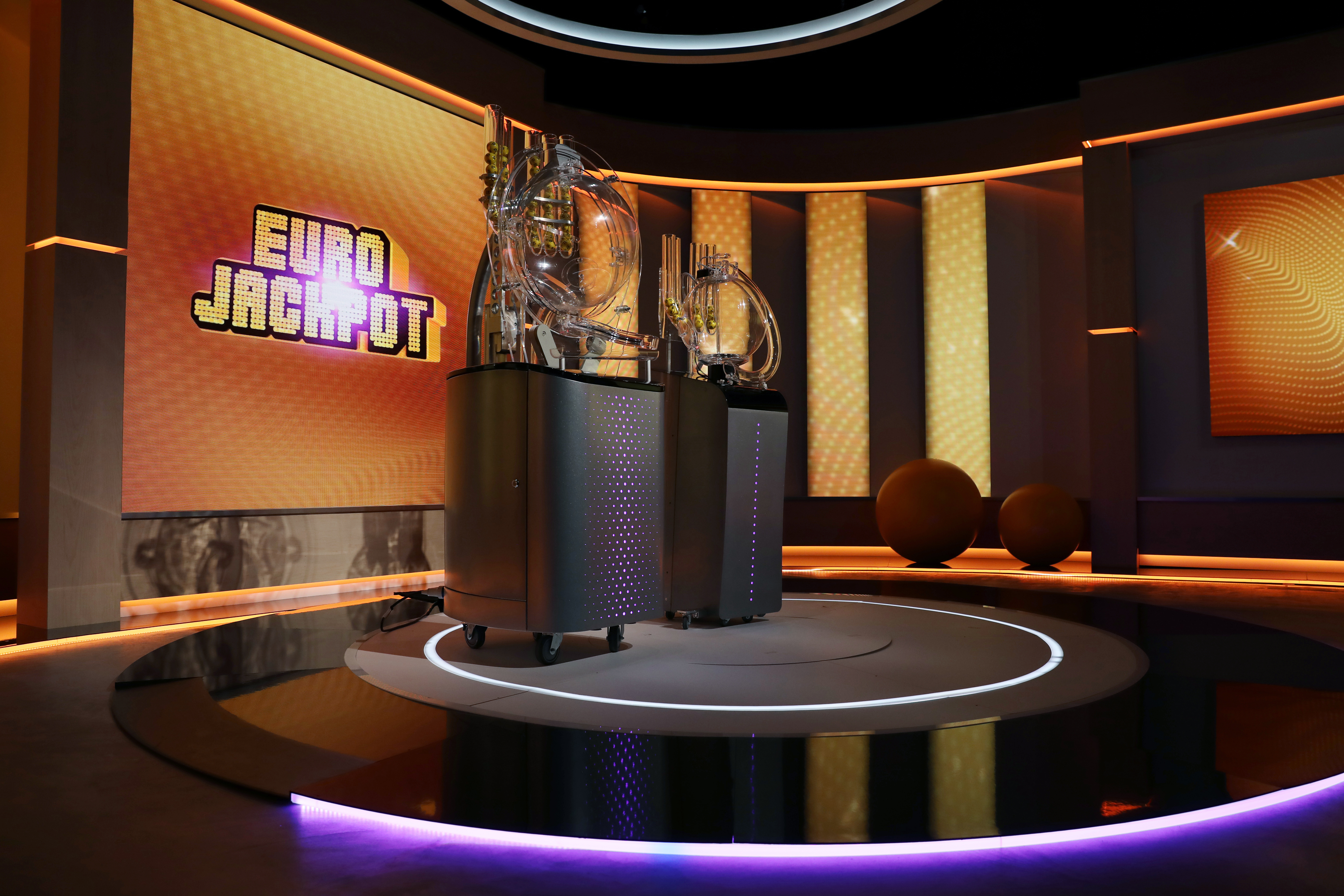 Iso huone, jossa on kaksi lottokonetta ja taustalla suuri "Eurojackpot"-teksti.