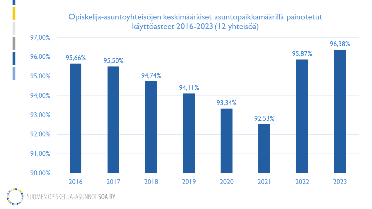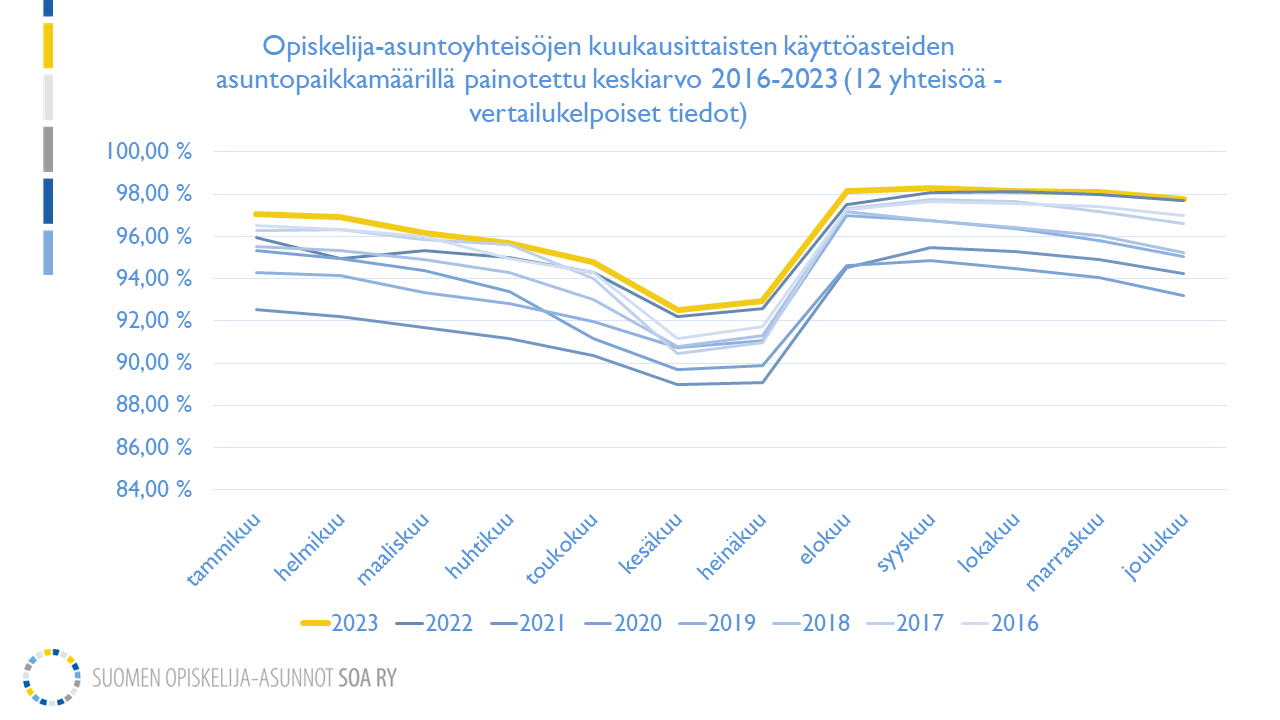 Opiskelija-asuntojen käyttöasteet ovat viime vuodet takoneet ennätyslukuja, käy ilmi Suomen opiskelija-asunnot SOA ry:n keräämästä tilastotiedosta. Mukana vertailussa on 12 opiskelija-asuntoyhteisöä, joilta on saatavissa yhtenäinen tilastosarja vuodesta 2016.