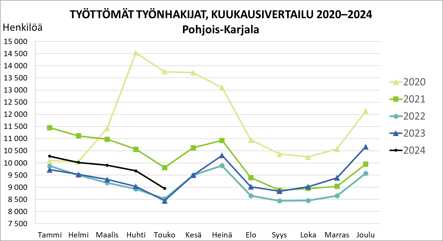 Työttömät työnhakijat Pohjois-Karjalassa 2019 - 2024.