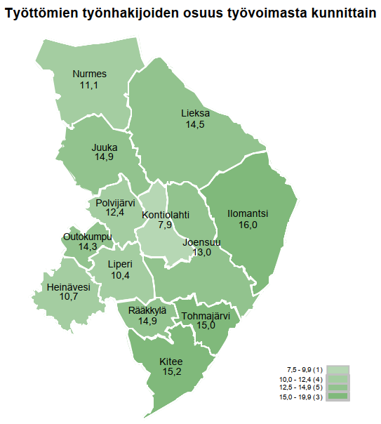 Työttömien työnhakijoiden osuus työvoimasta (71 279 henkilöä) oli 12,6 %. Vuosi sitten työttömien osuus työvoimasta (71 079 henkilöä) oli 11,9 %.