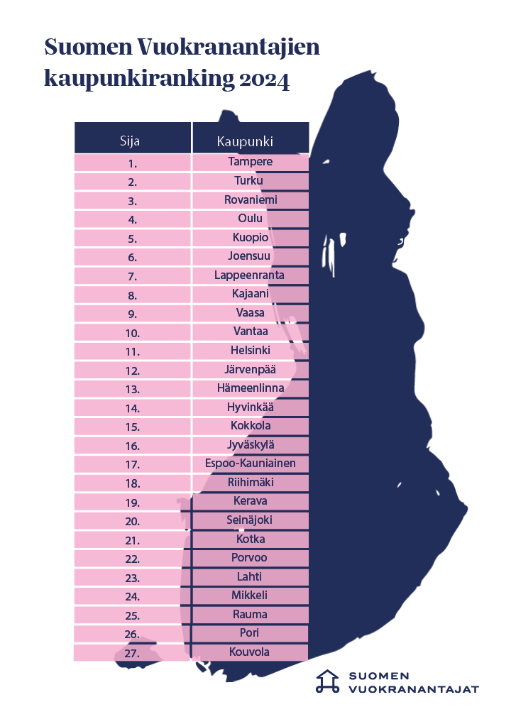Suomen Vuokranantajien kaupunkirankingin ykkössijasta pitää kiinni jo neljättä vuotta putkeen Tampere, kun samalla niskaan hengittää yhtä lailla jo neljättä vuotta peräkkäin Turku. Kolmannelle sijalle on noussut Rovaniemi, kun taas Helsinki tippui sijalle 11 sijalta kuusi. Kaupunkirankingissa arvioidaan 27 suurimman kaupungin houkuttelevuutta asuntosijoittajan näkökulmasta seitsemän eri mittarin avulla.