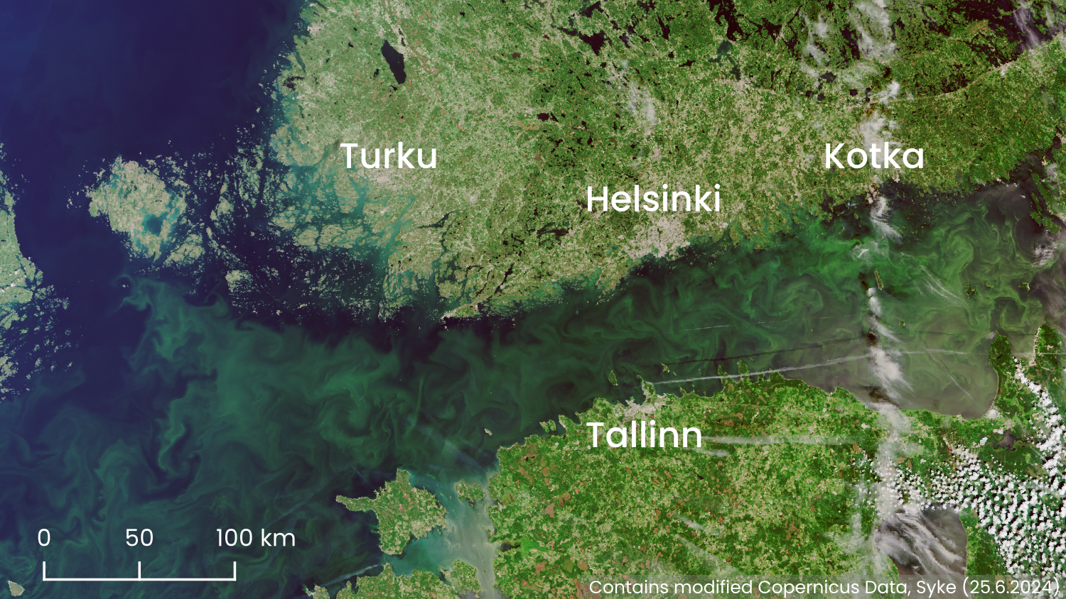 The cyanobacterial maps presented on the websites MarineFinland.fi and Waterinfo.fi combine the observations reported to the Järvi-meriwiki and from the beaches of the City of Helsinki, as well as the observations based on satellite interpretations made by Syke during the last three days.