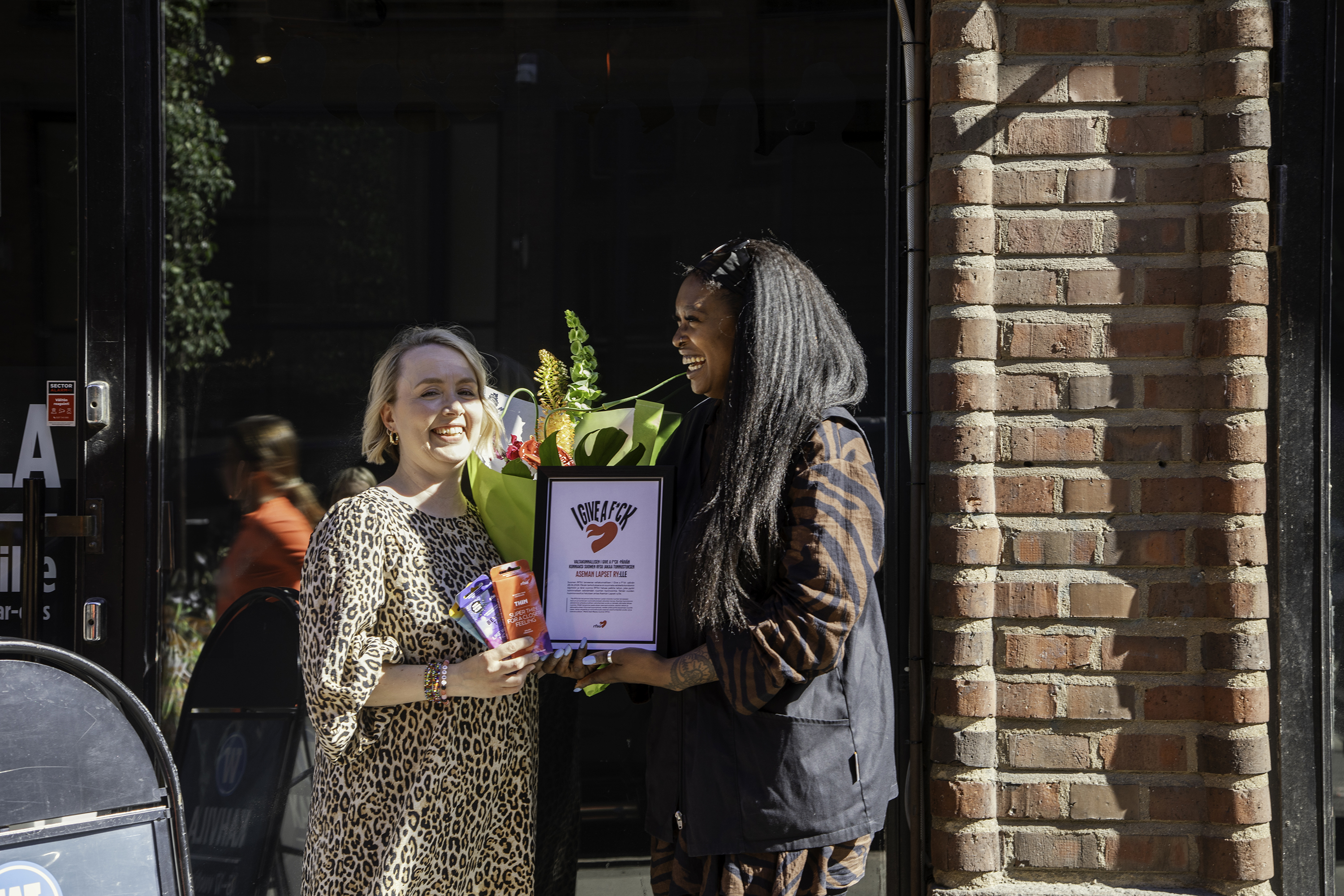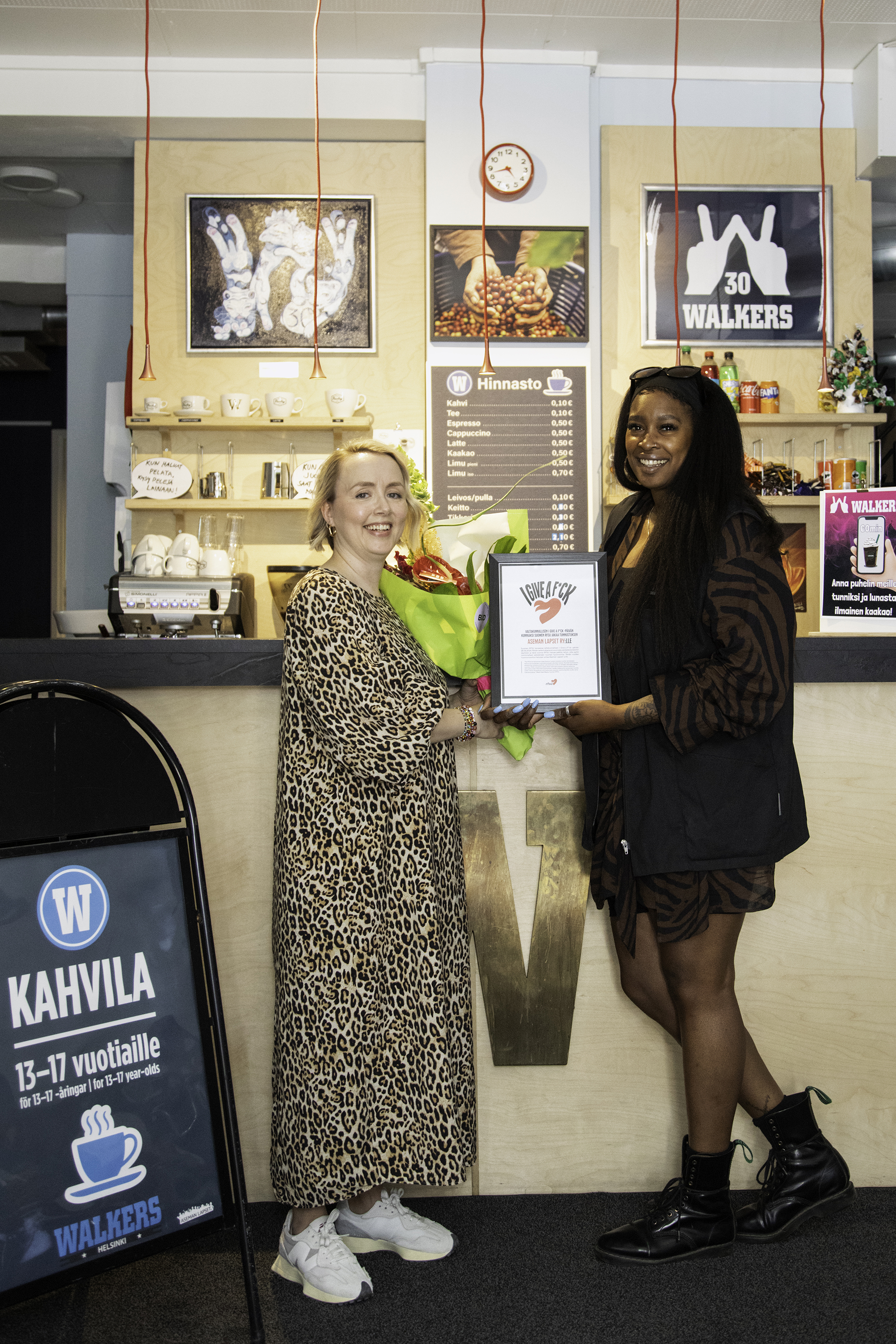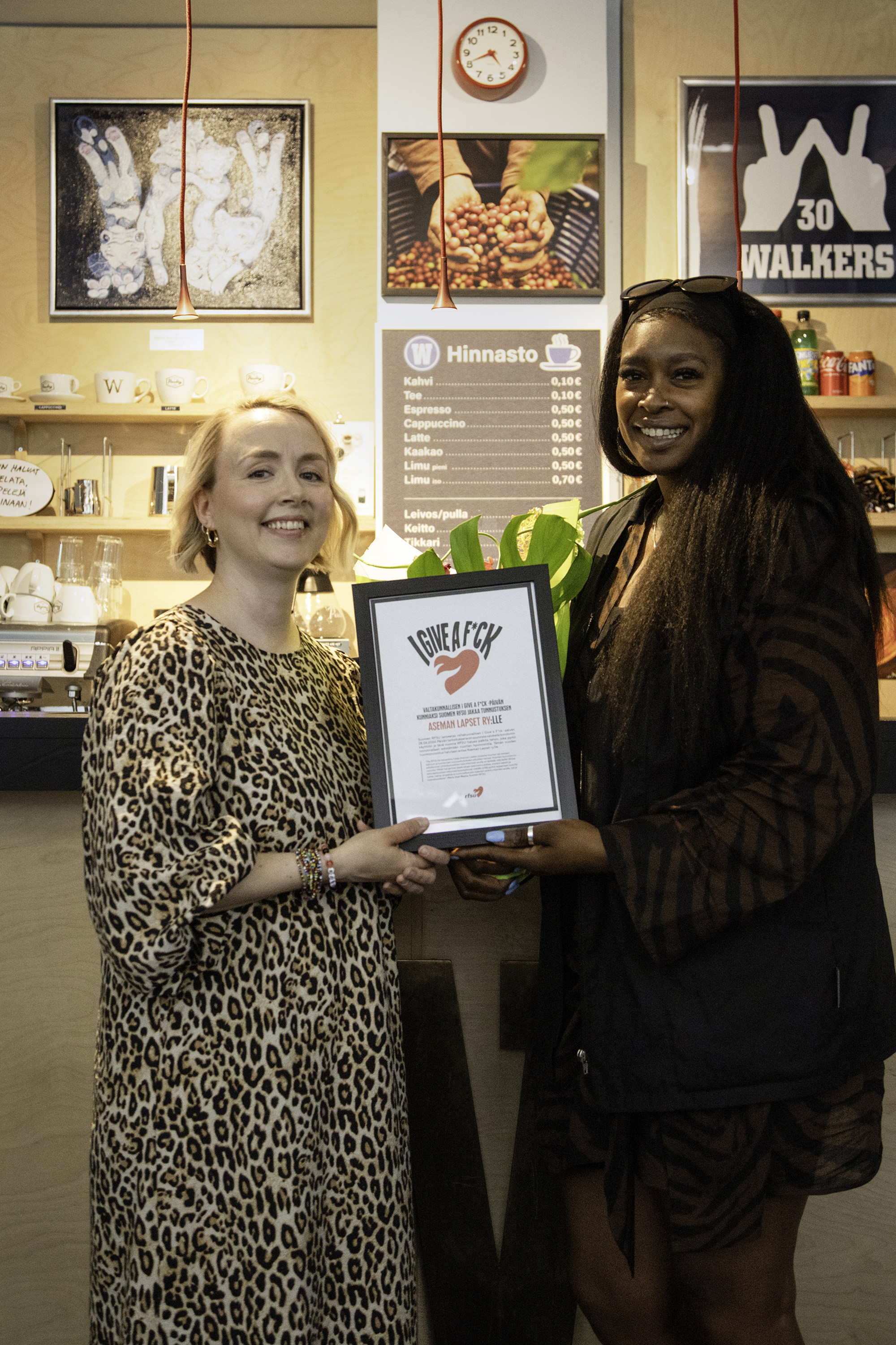 I Give a F*ck -sertifikaatti luovutettiin Aseman Lapset ry:lle Walkers-kahvilassa (kuvassa Maria Uusi-Rauva ja Nkiru Ikegwuonu).