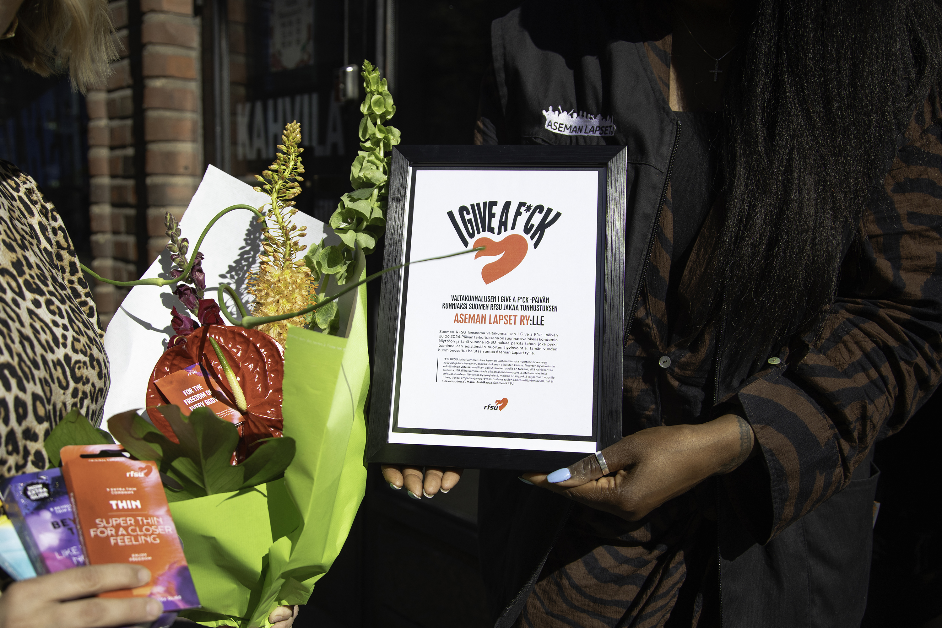 I Give a F*ck -päivänä annettava tunnustus Aseman Lapset ry:lle sisältää RFSU:n resursseja käytettäväksi seksuaalikasvatustyöhön ja RFSU:n tuotteita.
