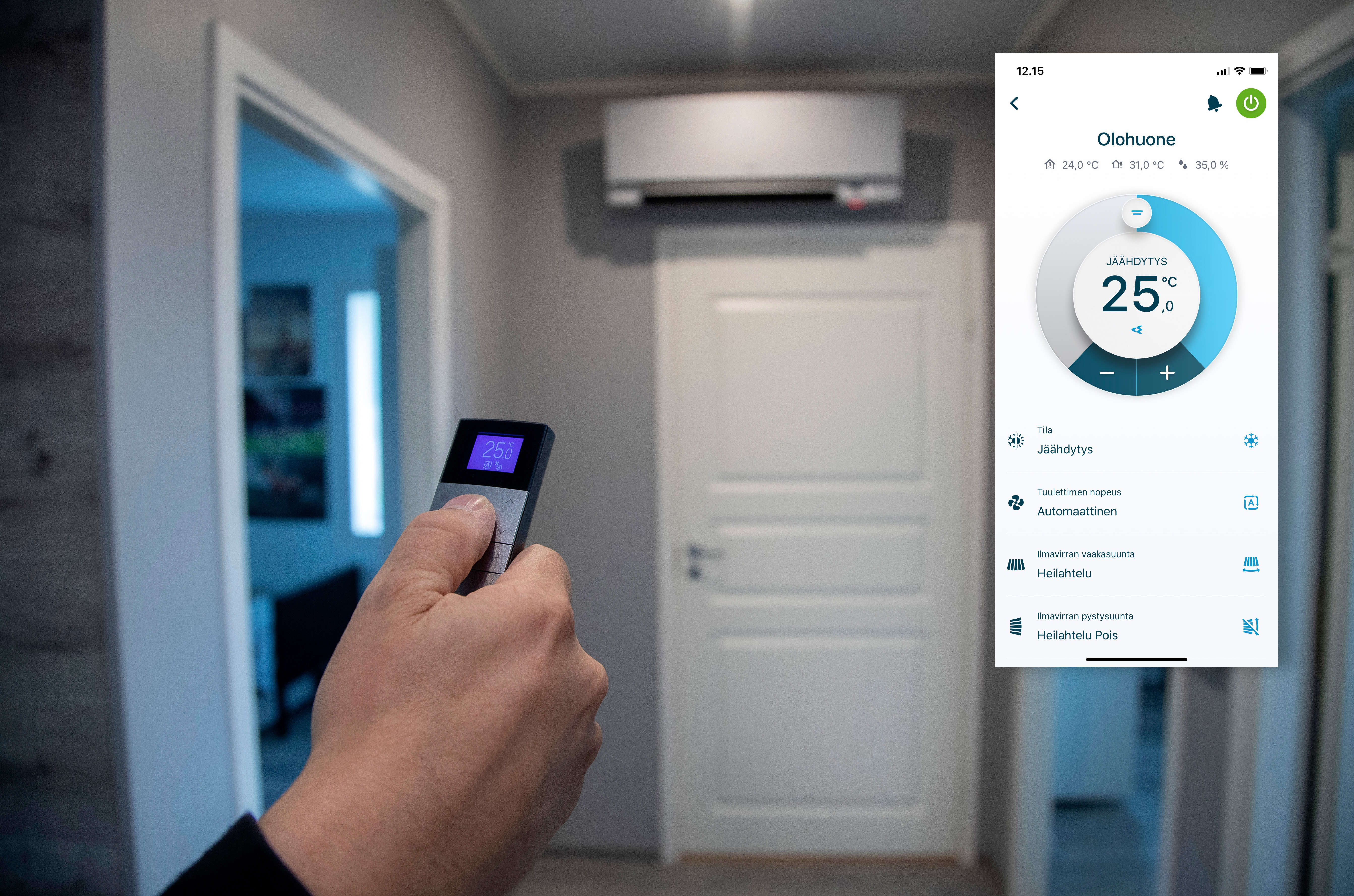 Jäähdytyksen tavoitelämpötila kannattaa asettaa vain pari astetta ulkoilmaa viileämmäksi. Ilmalämpöpumppu myös kuivaa sisäilmaa, joka tuntuu silloin viileämmältä. Langattoman kauko-ohjaimen lisäksi nykyaikaista ilmalämpöpumppua voi ohjata myös mobiililaitteen sovelluksella.