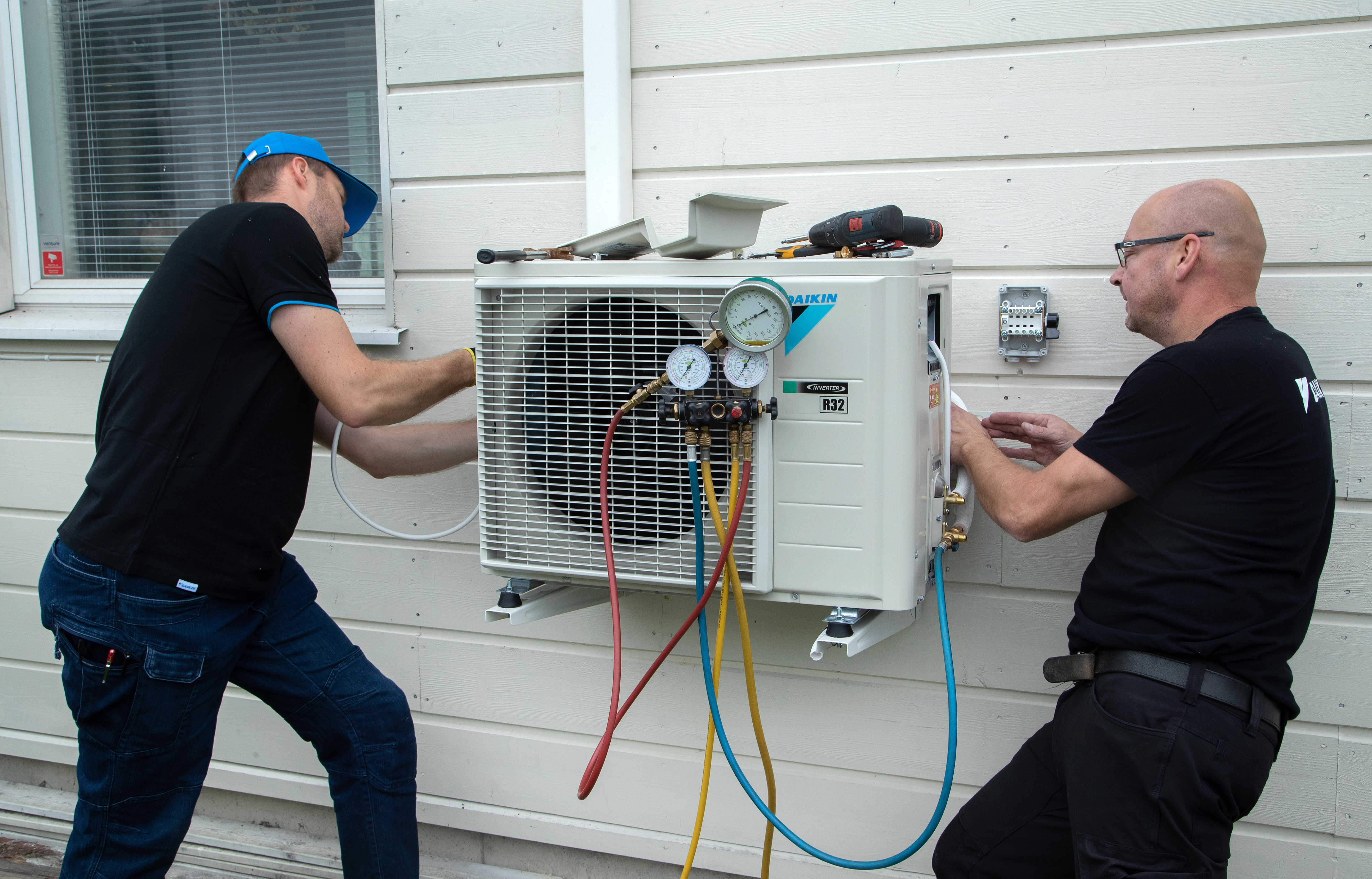 Nopea kesän tulo ja sitä seuranneet helleaallot ruuhkauttivat jäähdyttävien lämpöpumppujen asennukset monella paikkakunnalla. Alalla arvioidaan, että että asennusajoista voi olla pulaa myös syksyllä, kun ihmiset havahtuvat tilaamaan energiaa säästäviä lämmitysjärjestelmiä. Antero Tomson ja Mika Patjas asentamassa ilmalämpöpumpun ulkoyksikköä. Mauri Ratilainen