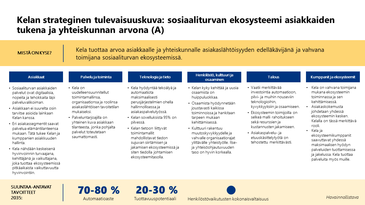 Tulevaisuuskuvassa kuvataan, mitä Kela tavoittelee eri osa-alueilla. Osa-alueita ovat asiakkaat, palvelu ja toiminta, teknologia ja tieto, henkilöstö, kulttuuri ja osaaminen, talous, kumppanit sekä ekosysteemi.