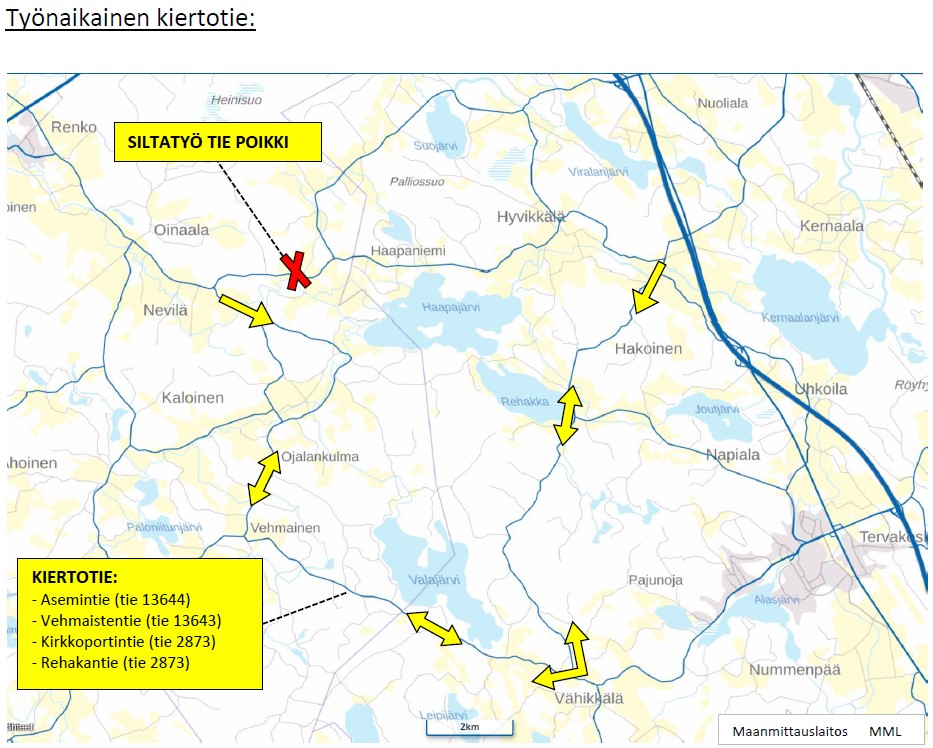 Liite: kartta, työnaikainen kiertotie: siltatyö, tie poikki