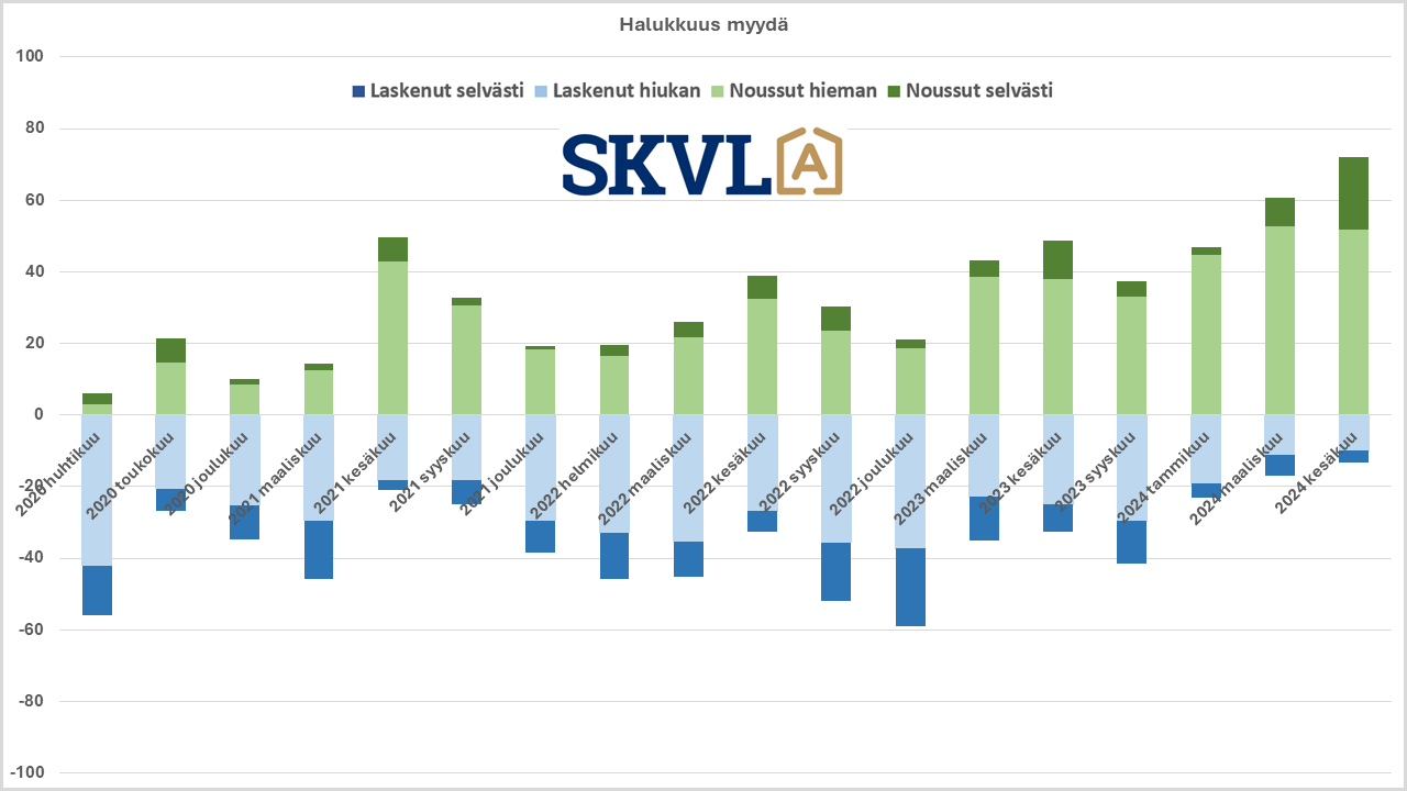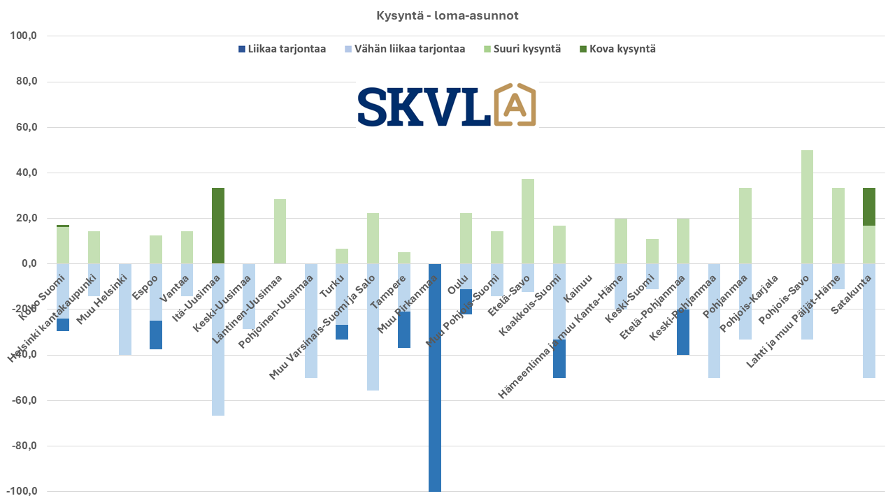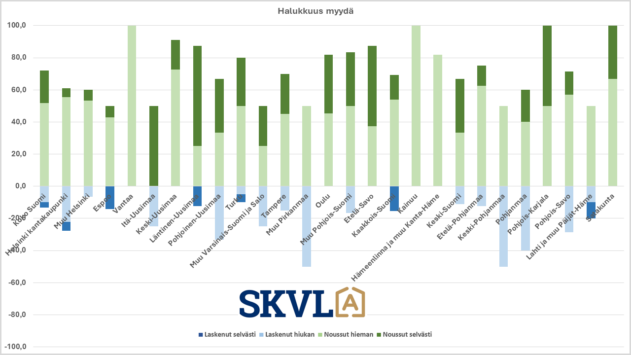 SKVL:n myyjien halukkuus myydä -mittari on noussut vahvasti ja ostajien ostohalukkuus -mittari on pysytellyt hyvällä tasolla, mutta ei noussut selvästi edellisestä neljänneksestä. Tilanne on johtanut tarjonnan selvään lisääntymiseen. ”Ostajilla on paljon valinnanvaraa ja tämä osaltaan tekee kaupankäynnistä jonkin verran hitaampaa ja vaihtoehtoja punnitaan pitkäänkin”, kommentoi Mannerberg. Paikoin Suomessa on ollut hiljainen kevät, mutta suurin osa välittäjistä raportoi kysynnän parantuneen jonkin verran. Tarjonnan ylittäessä kysynnän tällä hetkellä hinnoissa ei ole odotettavissa suuria liikkeitä ylös tai alaspäin.